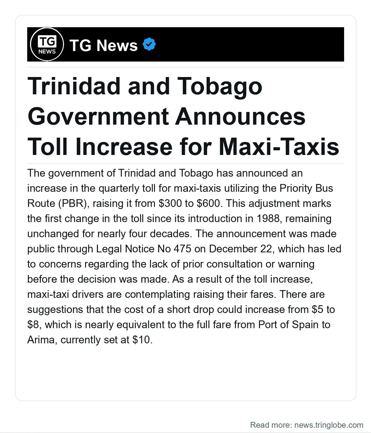 The government of Trinidad and Tobago has announced an increase in the quarterly toll for maxi-taxis utilizing the Priority Bus Route (PBR), raising it from $300 to $600. This adjustment marks the first change in the toll since its introduction in 1988, remaining unchanged for nearly four decades. The announcement was made public through Legal Notice No 475 on December 22, which has led to concerns regarding the lack of prior consultation or warning before the decision was made.