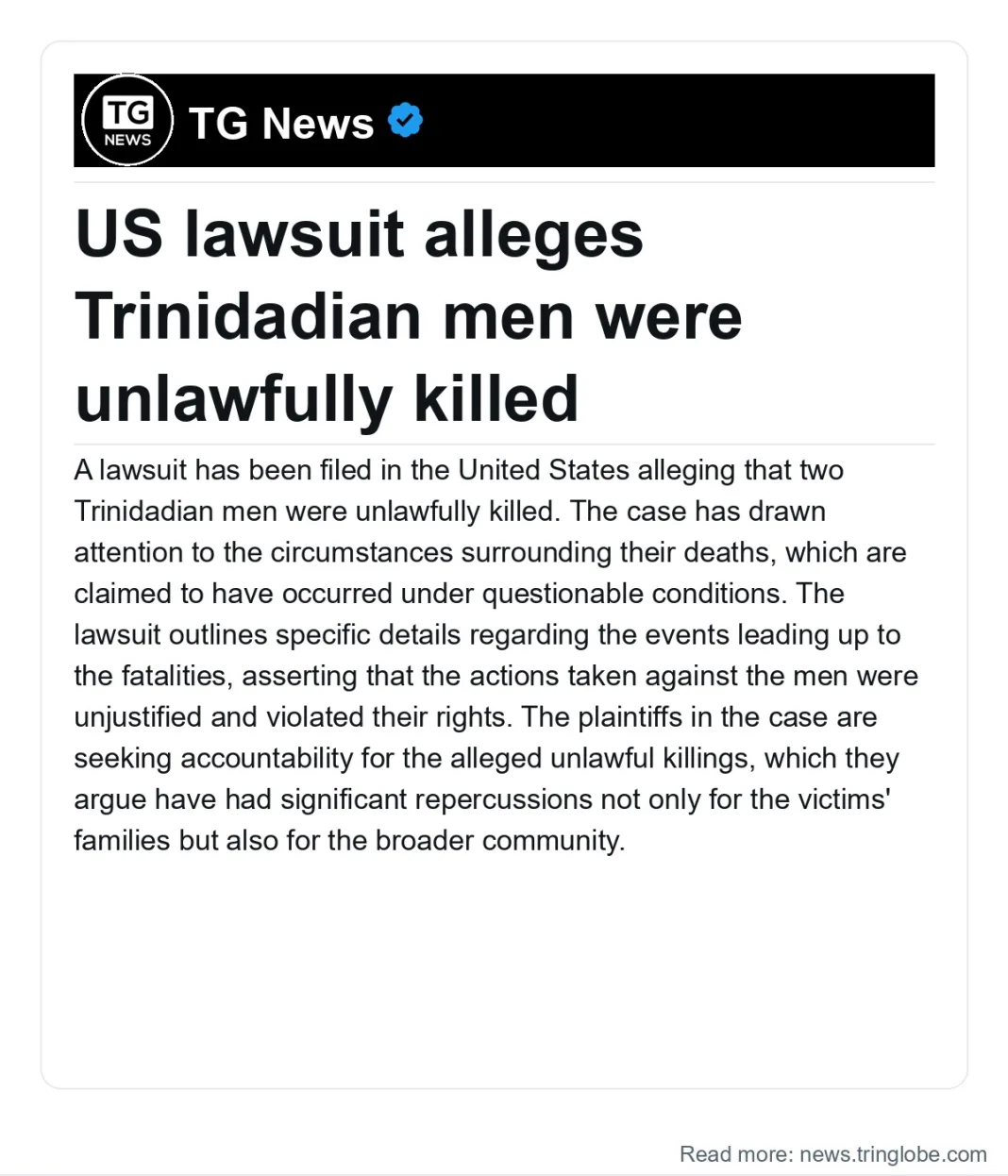 A lawsuit has been filed in the United States alleging that two Trinidadian men were unlawfully killed. The case has drawn attention to the circumstances surrounding their deaths, which are claimed to have occurred under questionable conditions. The lawsuit outlines specific details regarding the events leading up to the fatalities, asserting that the actions taken against the men were unjustified and violated their rights.