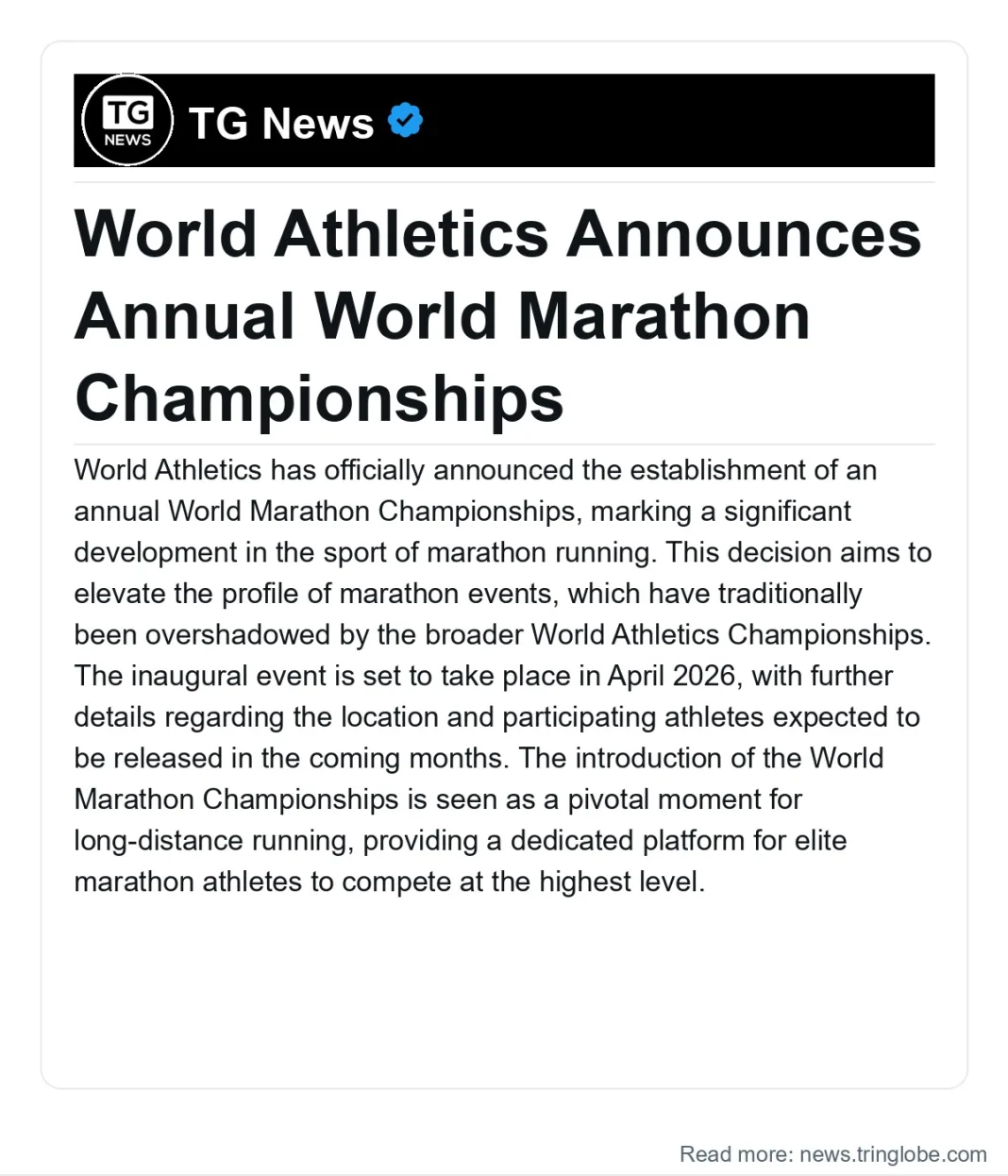 The inaugural event is set to take place in April 2026, with further details regarding the location and participating athletes expected to be released in the coming months. The introduction of the World Marathon Championships is seen as a pivotal moment for long-distance running, providing a dedicated platform for elite marathon athletes to compete at the highest level.