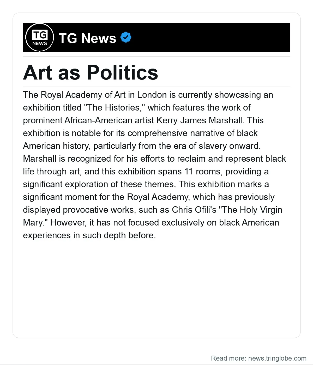 The Royal Academy of Art in London is currently showcasing an exhibition titled “The Histories,” which features the work of prominent African-American artist Kerry James Marshall. This exhibition is notable for its comprehensive narrative of black American history, particularly from the era of slavery onward. Marshall is recognized for his efforts to reclaim and represent black life through art, and this exhibition spans 11 rooms, providing a significant exploration of these themes.