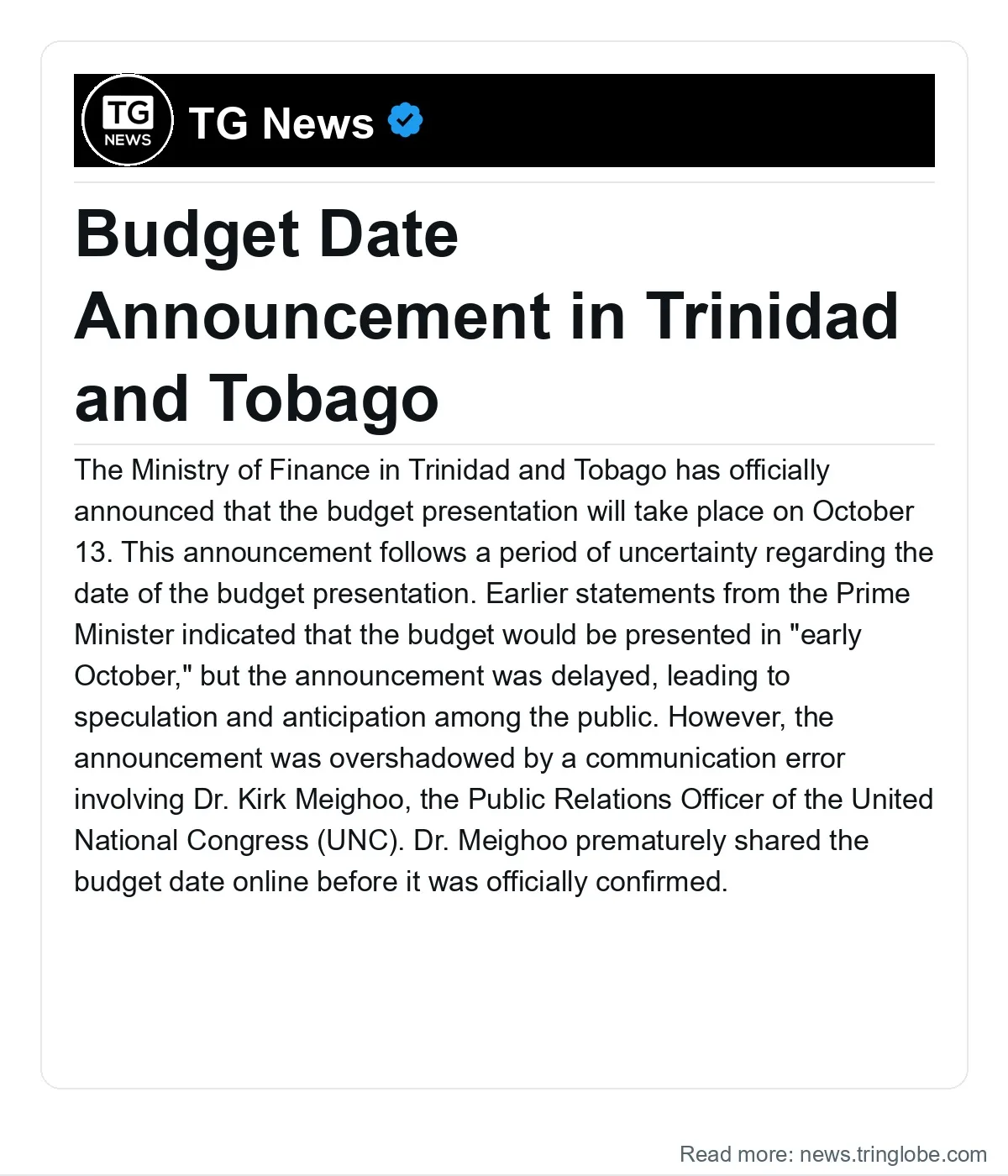 In summary, the announcement of the budget presentation date has generated a mix of anticipation and concern among the public and political figures alike. The communication error by Dr. Meighoo serves as a reminder of the importance of accurate information sharing, especially in the political arena. As Trinidad and Tobago prepares for the upcoming budget, the focus will likely remain on how the government navigates the challenges posed by the timing of the presentation and the implications it may have for the fiscal year ahead.