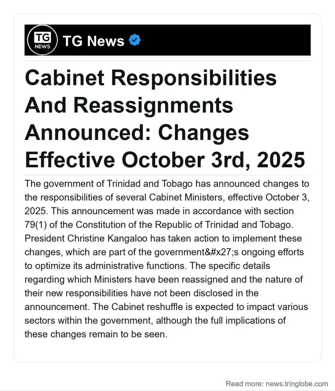 Further details may be released in the coming days as the government provides more information on the specific changes made. The Cabinet reshuffle is a significant event in the political landscape of Trinidad and Tobago, as it can lead to new priorities and initiatives within the government.