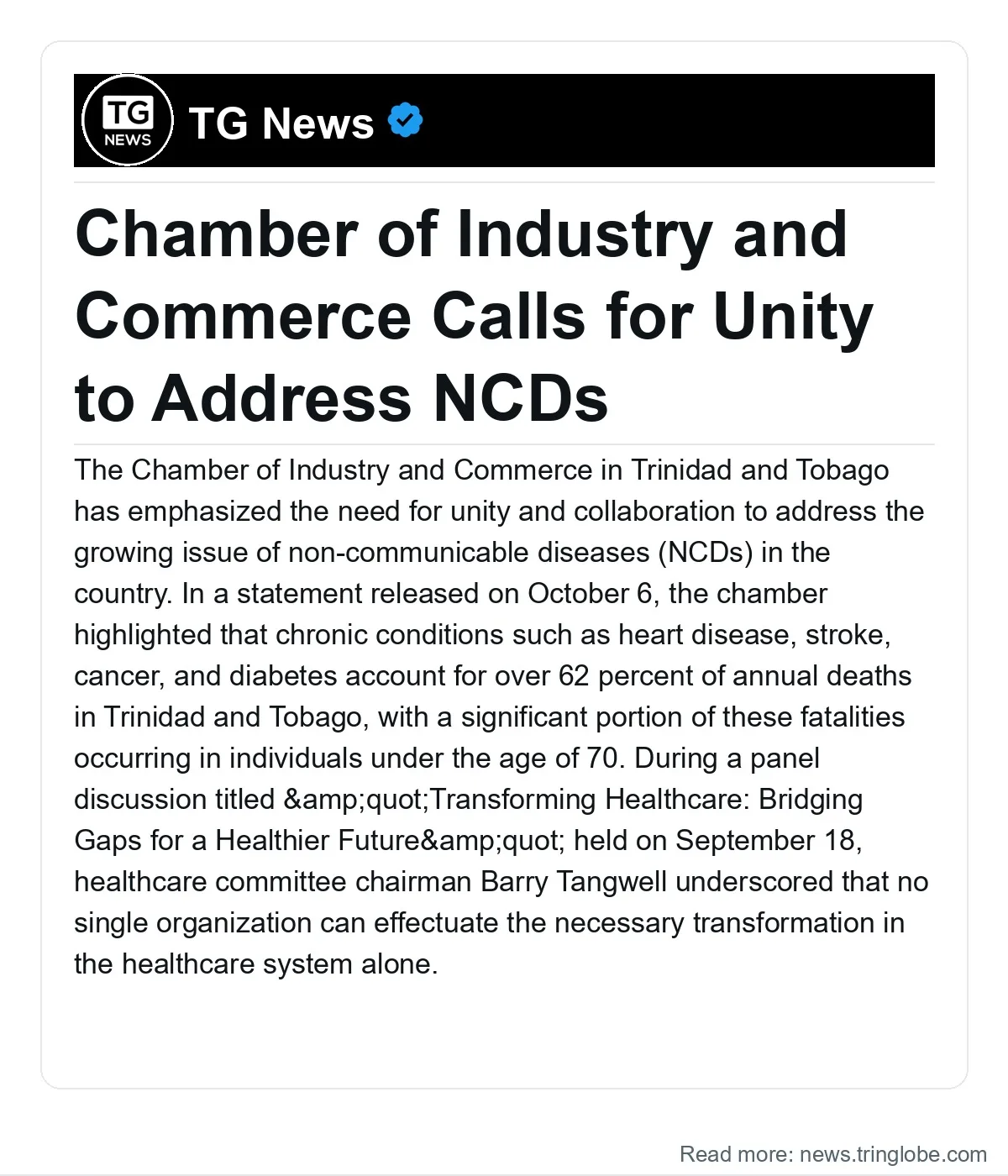 The Chamber of Industry and Commerce in Trinidad and Tobago has emphasized the need for unity and collaboration to address the growing issue of non-communicable diseases (NCDs) in the country. In a statement released on October 6, the chamber highlighted that chronic conditions such as heart disease, stroke, cancer, and diabetes account for over 62 percent of annual deaths in Trinidad and Tobago, with a significant portion of these fatalities occurring in individuals under the age of 70. During a panel discussion titled “Transforming Healthcare: Bridging Gaps for a Healthier Future” held on September 18, healthcare committee chairman Barry Tangwell underscored that no single organization can effectuate the necessary transformation in the healthcare system alone. He called for a shift from “building empires” to “building ecosystems” through genuine partnerships that integrate efforts across public, private, and civil society sectors. The goal, he stated, is to enhance patient outcomes and ensure a focus on the needs of the population. Roche Pharma’s general manager, Alvaro Soto, pointed out that a lack of trust in the healthcare system poses a significant barrier to effective public-private collaboration. He urged for a collective commitment to develop comprehensive, data-driven solutions that could improve diagnostic capabilities and offer personalized medical solutions. The panel also acknowledged the importance of innovation in modernizing the healthcare system. Dr. Henry Bailey from the UWI Health Economics Unit noted that while Trinidad and Tobago possesses the necessary tools for health technology assessment, these tools are not currently utilized in the public sector. Additionally, Dr. Kimberly Badal from the Caribbean Cancer Research Institute proposed a scalable project that would utilize electronic medical records to track patient journeys from screening to treatment. The chamber has identified five key areas for focus: collaboration and public-private partnerships, NCD management, eHealth, financial sustainability, and tender diversification. It has invited the Health Minister and other relevant stakeholders to engage in ongoing consultations aimed at fostering a healthier future for the population of Trinidad and Tobago.