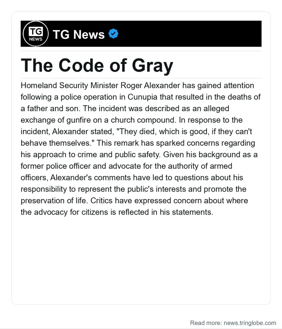 Homeland Security Minister Roger Alexander has gained attention following a police operation in Cunupia that resulted in the deaths of a father and son. The incident was described as an alleged exchange of gunfire on a church compound. In response to the incident, Alexander stated, “They died, which is good, if they can’t behave themselves.” This remark has sparked concerns regarding his approach to crime and public safety.
