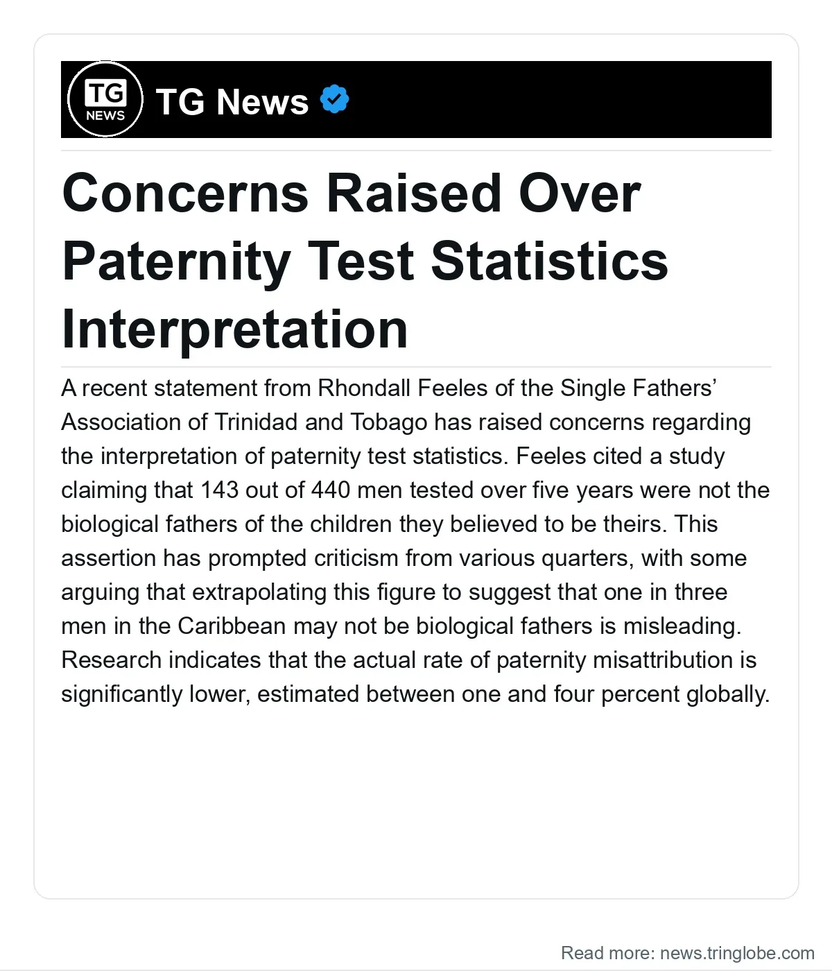 A recent statement from Rhondall Feeles of the Single Fathers’ Association of Trinidad and Tobago has raised concerns regarding the interpretation of paternity test statistics. Feeles cited a study claiming that 143 out of 440 men tested over five years were not the biological fathers of the children they believed to be theirs. This assertion has prompted criticism from various quarters, with some arguing that extrapolating this figure to suggest that one in three men in the Caribbean may not be biological fathers is misleading.
