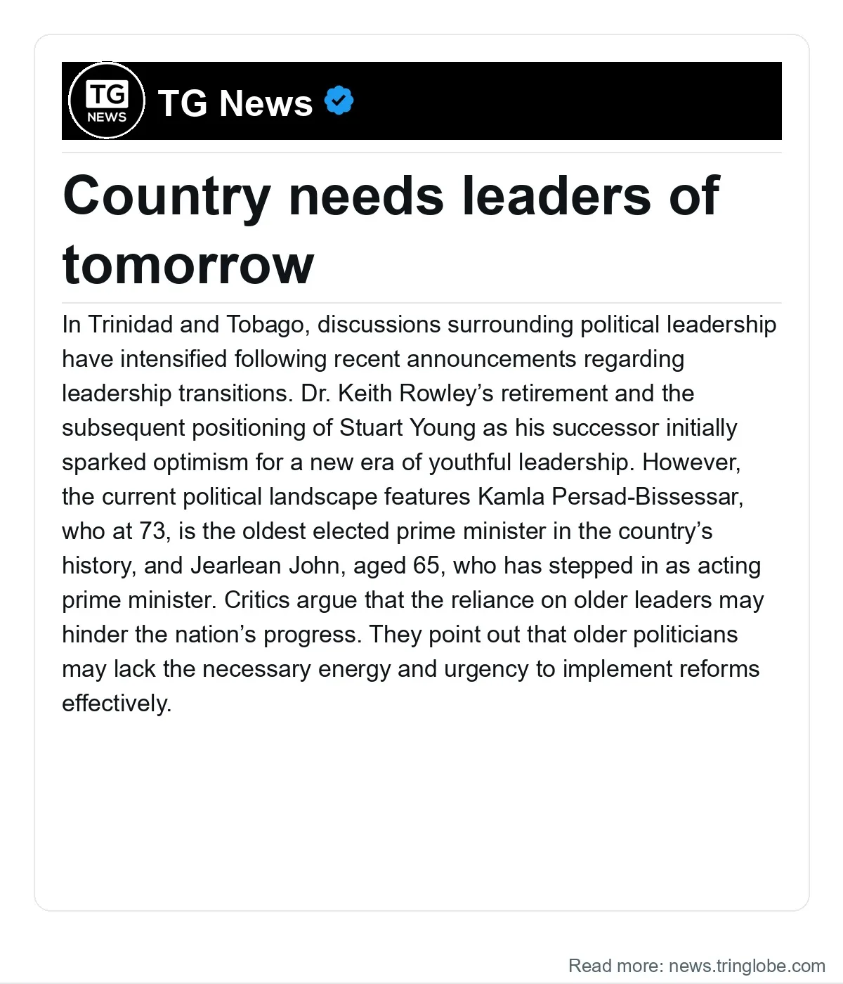 In Trinidad and Tobago, discussions surrounding political leadership have intensified following recent announcements regarding leadership transitions. Dr. Keith Rowley’s retirement and the subsequent positioning of Stuart Young as his successor initially sparked optimism for a new era of youthful leadership. However, the current political landscape features Kamla Persad-Bissessar, who at 73, is the oldest elected prime minister in the country’s history, and Jearlean John, aged 65, who has stepped in as acting prime minister.