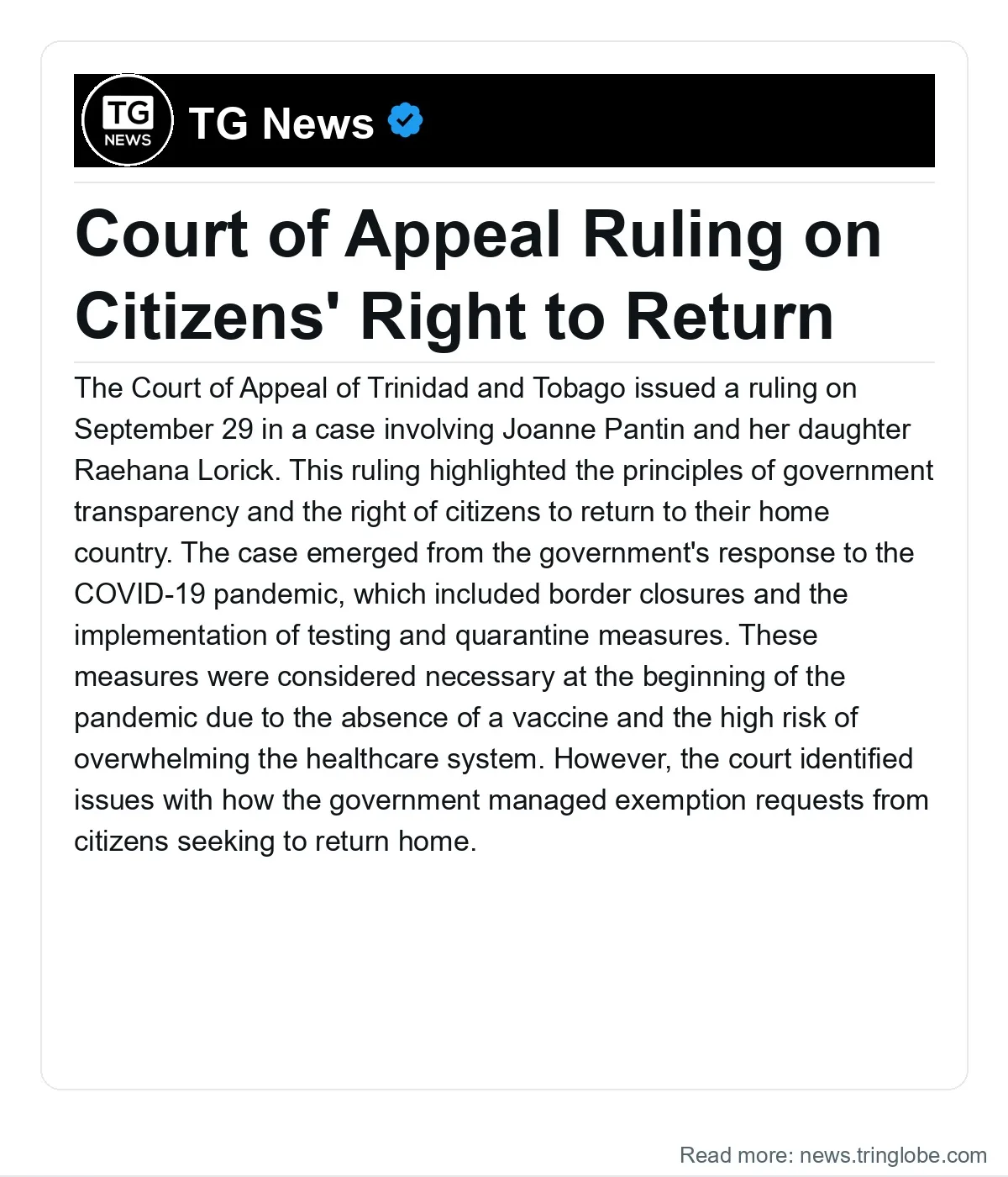 The Court of Appeal of Trinidad and Tobago issued a ruling on September 29 in a case involving Joanne Pantin and her daughter Raehana Lorick. This ruling highlighted the principles of government transparency and the right of citizens to return to their home country. The case emerged from the government’s response to the COVID-19 pandemic, which included border closures and the implementation of testing and quarantine measures. These measures were considered necessary at the beginning of the pandemic due to the absence of a vaccine and the high risk of overwhelming the healthcare system.