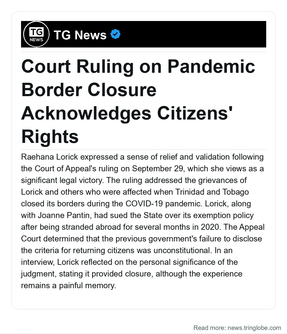 Raehana Lorick expressed a sense of relief and validation following the Court of Appeal’s ruling on September 29, which she views as a significant legal victory. The ruling addressed the grievances of Lorick and others who were affected when Trinidad and Tobago closed its borders during the COVID-19 pandemic. Lorick, along with Joanne Pantin, had sued the State over its exemption policy after being stranded abroad for several months in 2020.