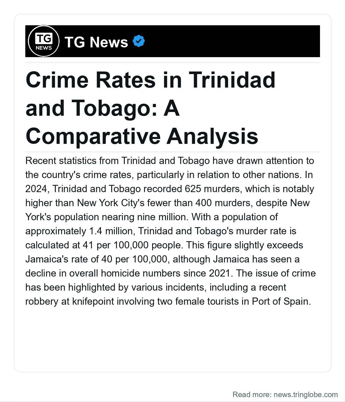 Recent statistics from Trinidad and Tobago have drawn attention to the country’s crime rates, particularly in relation to other nations. In 2024, Trinidad and Tobago recorded 625 murders, which is notably higher than New York City’s fewer than 400 murders, despite New York’s population nearing nine million. With a population of approximately 1.4 million, Trinidad and Tobago’s murder rate is calculated at 41 per 100,000 people. This figure slightly exceeds Jamaica’s rate of 40 per 100,000, although Jamaica has seen a decline in overall homicide numbers since 2021.