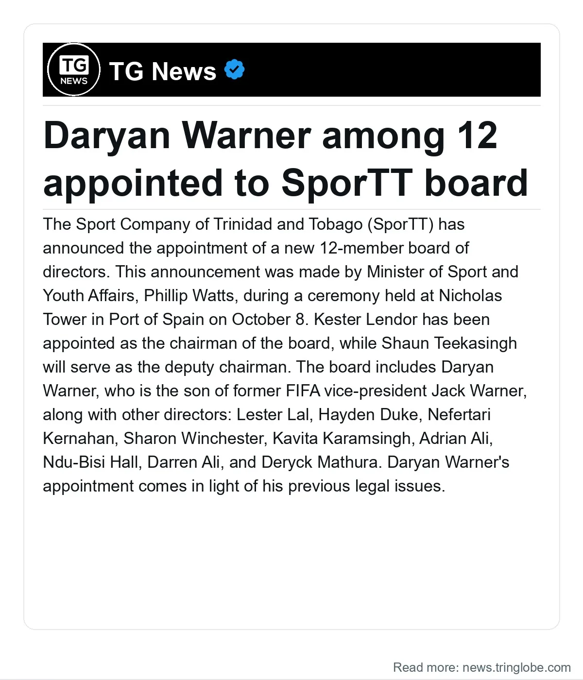 Kester Lendor has been appointed as the chairman of the board, while Shaun Teekasingh will serve as the deputy chairman. The board includes Daryan Warner, who is the son of former FIFA vice-president Jack Warner, along with other directors: Lester Lal, Hayden Duke, Nefertari Kernahan, Sharon Winchester, Kavita Karamsingh, Adrian Ali, Ndu-Bisi Hall, Darren Ali, and Deryck Mathura.