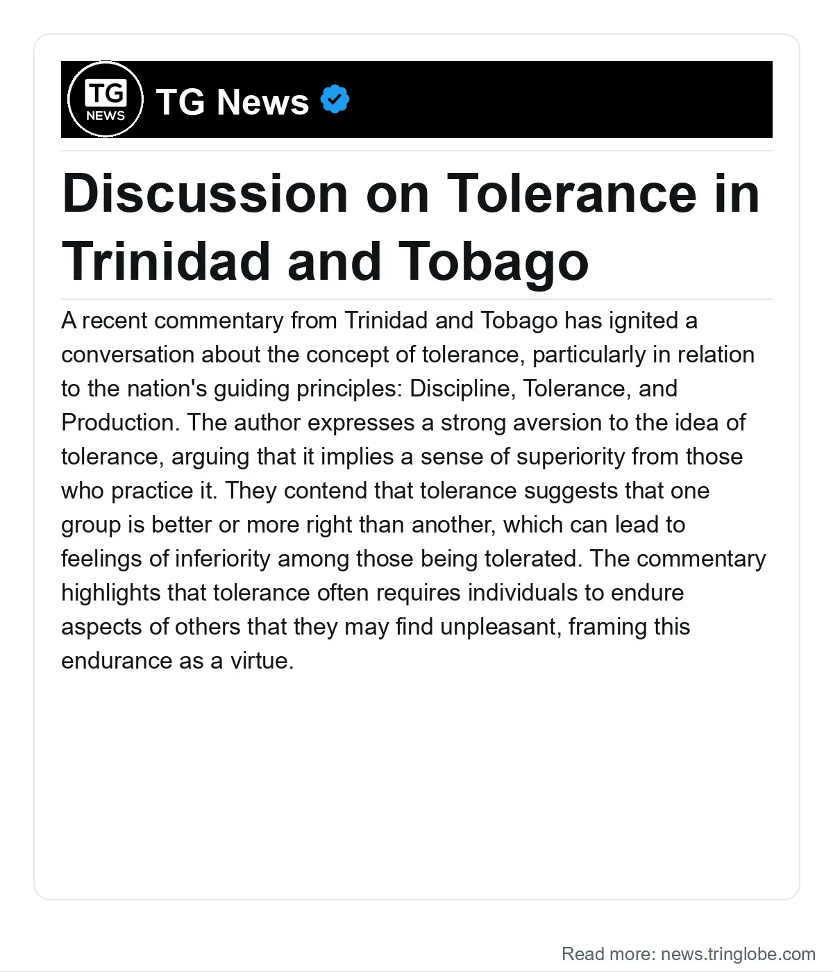 Ultimately, the discussion surrounding tolerance in Trinidad and Tobago serves as a reminder of the complexities of human relationships and the importance of fostering an environment where all individuals feel valued and respected. The commentary encourages ongoing dialogue about how best to achieve this goal and the role that each person can play in creating a more inclusive society.