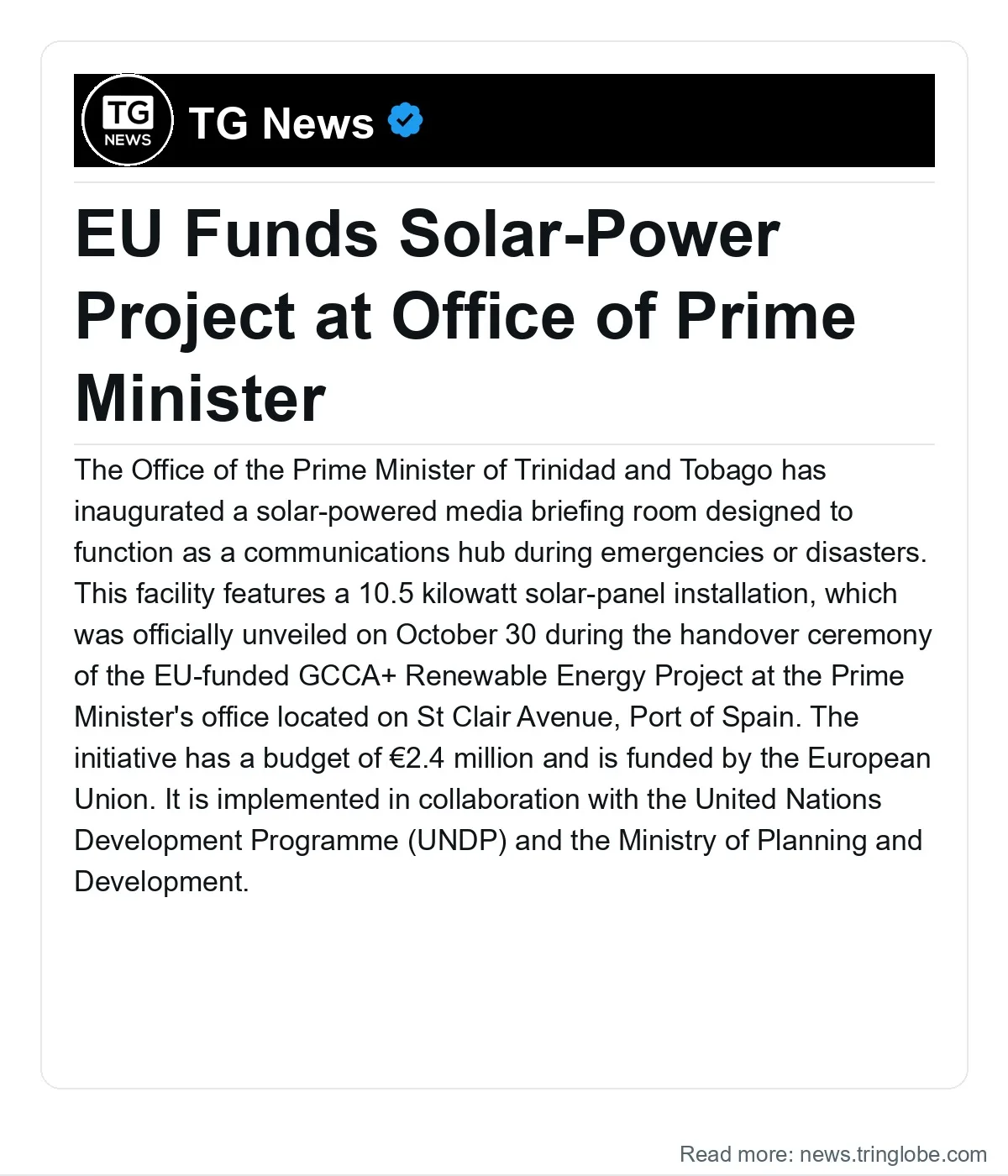The Office of the Prime Minister of Trinidad and Tobago has inaugurated a solar-powered media briefing room designed to function as a communications hub during emergencies or disasters. This facility features a 10.5 kilowatt solar-panel installation, which was officially unveiled on October 30 during the handover ceremony of the EU-funded GCCA+ Renewable Energy Project at the Prime Minister’s office located on St Clair Avenue, Port of Spain.