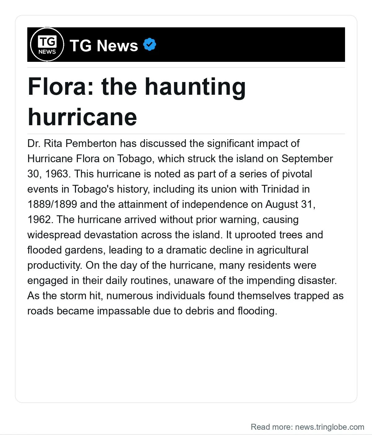 Dr. Rita Pemberton has discussed the significant impact of Hurricane Flora on Tobago, which struck the island on September 30, 1963. This hurricane is noted as part of a series of pivotal events in Tobago’s history, including its union with Trinidad in 1889/1899 and the attainment of independence on August 31, 1962.