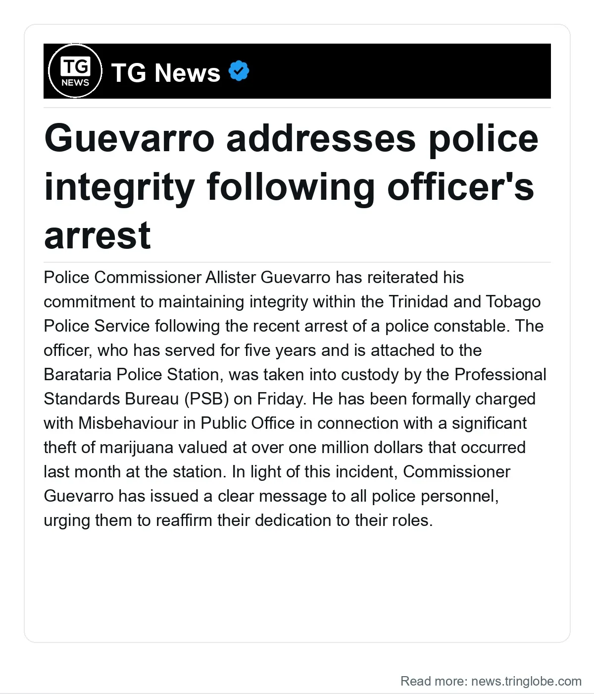Police Commissioner Allister Guevarro has reiterated his commitment to maintaining integrity within the Trinidad and Tobago Police Service following the recent arrest of a police constable. The officer, who has served for five years and is attached to the Barataria Police Station, was taken into custody by the Professional Standards Bureau (PSB) on Friday. He has been formally charged with Misbehaviour in Public Office in connection with a significant theft of marijuana valued at over one million dollars that occurred last month at the station.