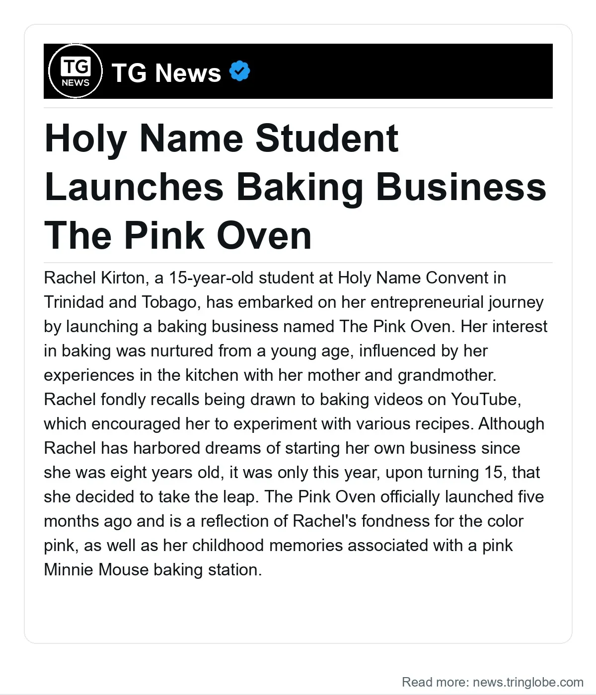 Rachel Kirton, a 15-year-old student at Holy Name Convent in Trinidad and Tobago, has embarked on her entrepreneurial journey by launching a baking business named The Pink Oven. Her interest in baking was nurtured from a young age, influenced by her experiences in the kitchen with her mother and grandmother. Rachel fondly recalls being drawn to baking videos on YouTube, which encouraged her to experiment with various recipes.