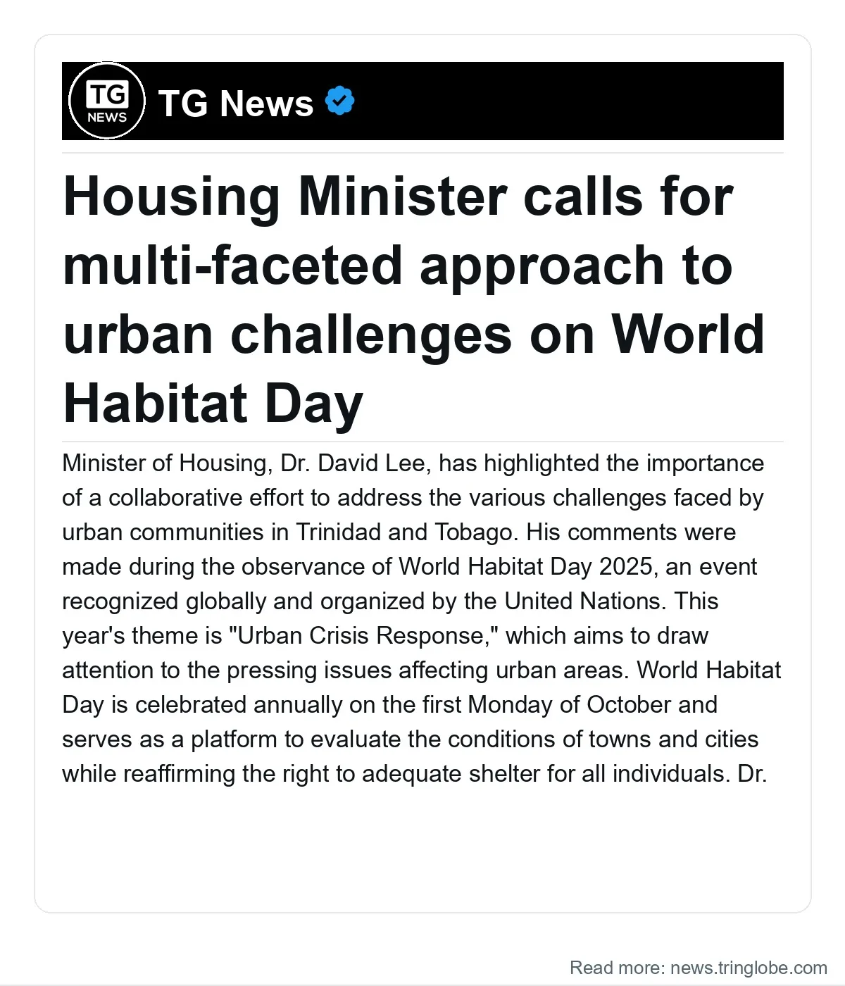 Minister of Housing, Dr. David Lee, has highlighted the importance of a collaborative effort to address the various challenges faced by urban communities in Trinidad and Tobago. His comments were made during the observance of World Habitat Day 2025, an event recognized globally and organized by the United Nations. This year’s theme is “Urban Crisis Response,” which aims to draw attention to the pressing issues affecting urban areas.