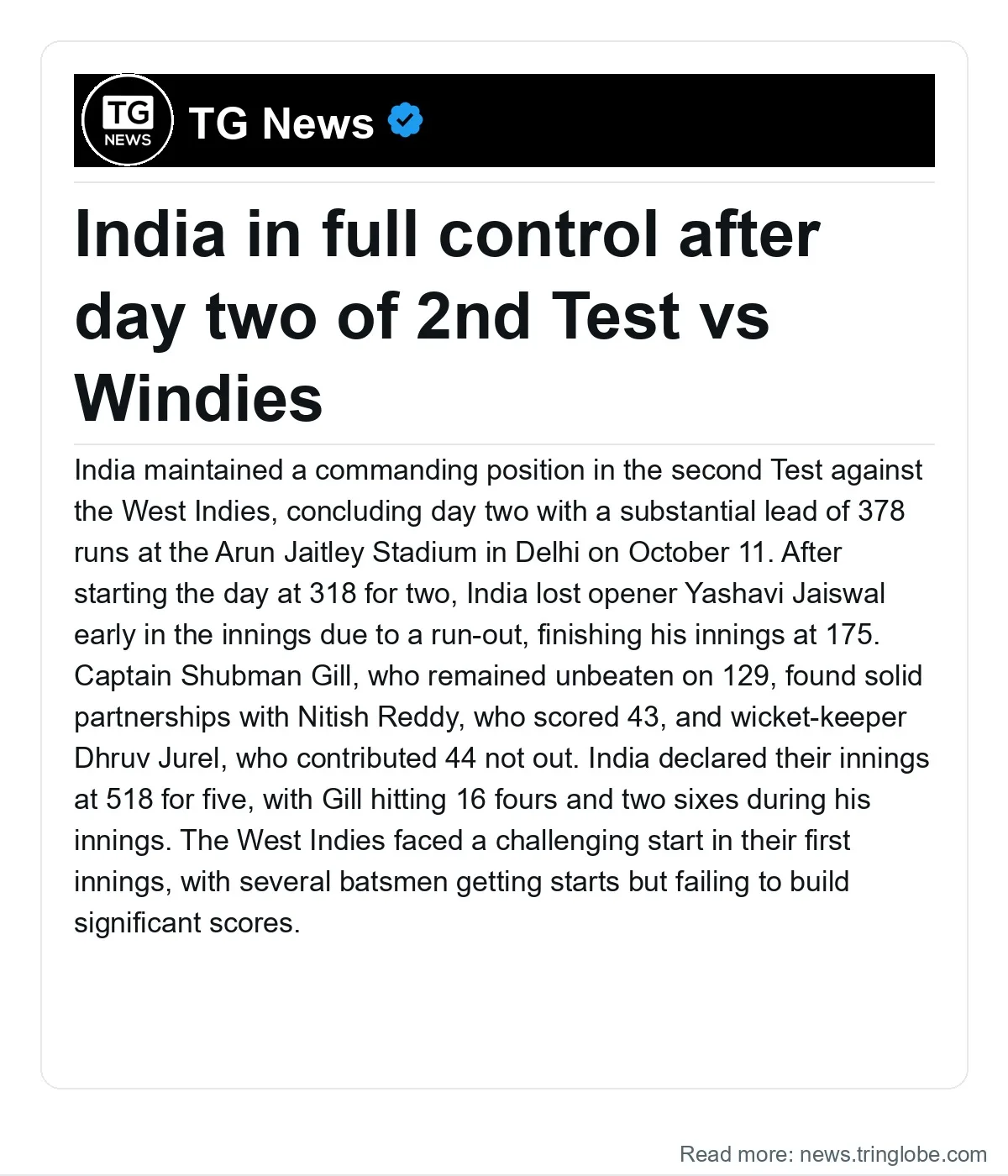 Throughout the match, the Indian batsmen displayed a mix of aggression and patience, adapting well to the conditions. The West Indies bowlers, despite their efforts, found it difficult to penetrate the Indian batting order, which has been in good form. The performance of the Indian batsmen has been a key factor in their commanding position, and they will seek to extend their lead further on the third day.