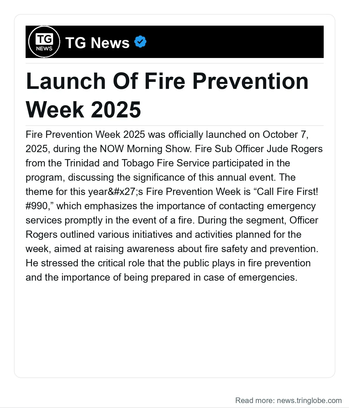Fire Prevention Week 2025 was officially launched on October 7, 2025, during the NOW Morning Show. Fire Sub Officer Jude Rogers from the Trinidad and Tobago Fire Service participated in the program, discussing the significance of this annual event. The theme for this year's Fire Prevention Week is “Call Fire First! #990,” which emphasizes the importance of contacting emergency services promptly in the event of a fire.