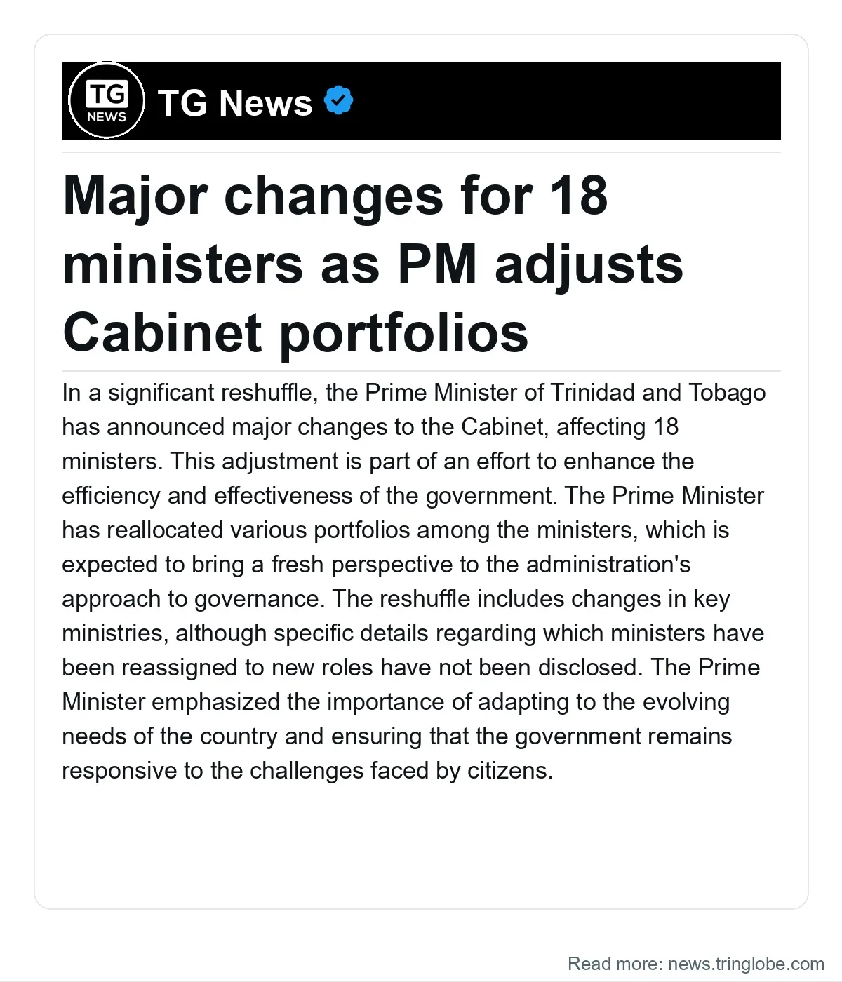 In a significant reshuffle, the Prime Minister of Trinidad and Tobago has announced major changes to the Cabinet, affecting 18 ministers. This adjustment is part of an effort to enhance the efficiency and effectiveness of the government. The Prime Minister has reallocated various portfolios among the ministers, which is expected to bring a fresh perspective to the administration’s approach to governance.