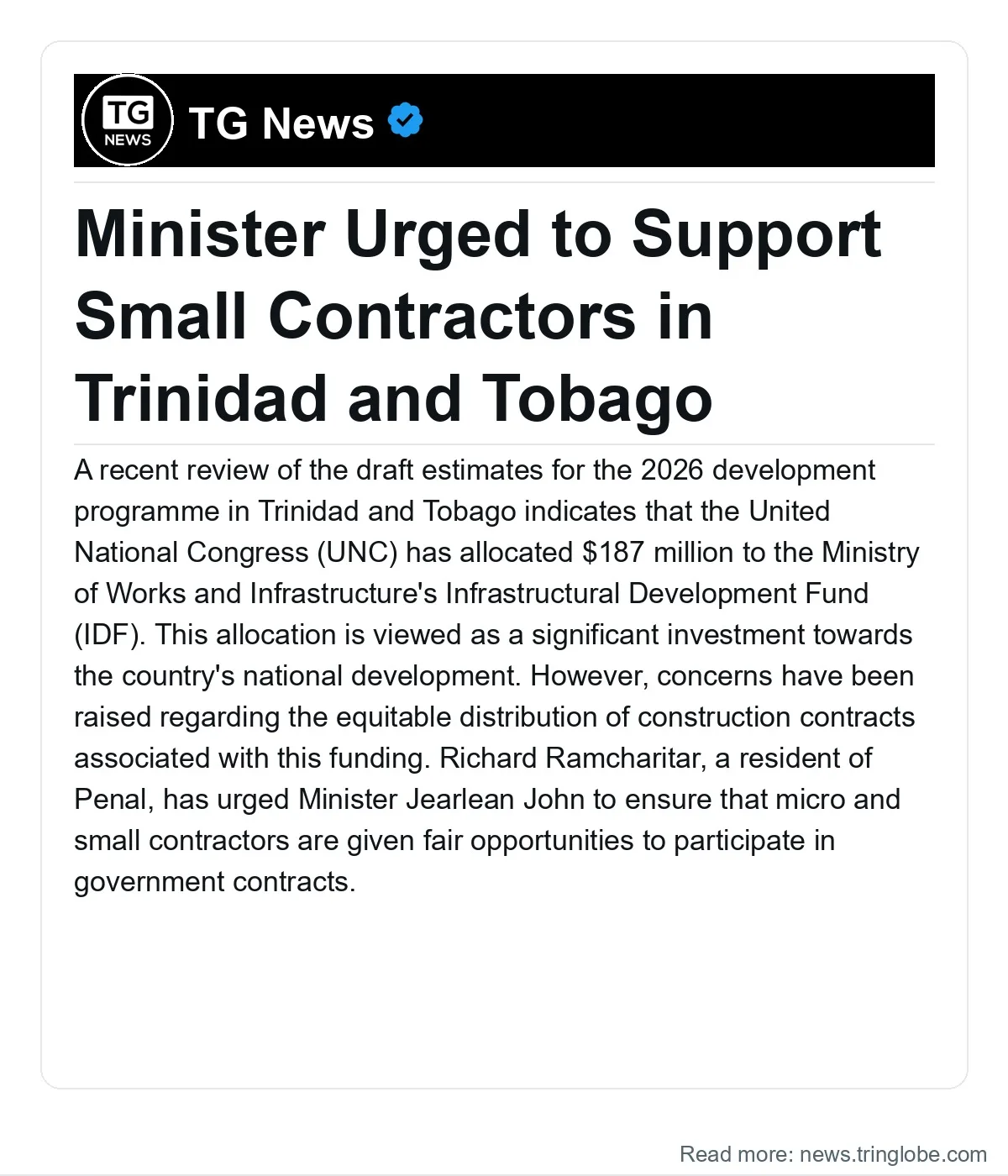 However, concerns have been raised regarding the equitable distribution of construction contracts associated with this funding. Richard Ramcharitar, a resident of Penal, has urged Minister Jearlean John to ensure that micro and small contractors are given fair opportunities to participate in government contracts. He highlighted that medium and large contractors often dominate these opportunities, which can marginalize smaller businesses that are crucial to local economies.