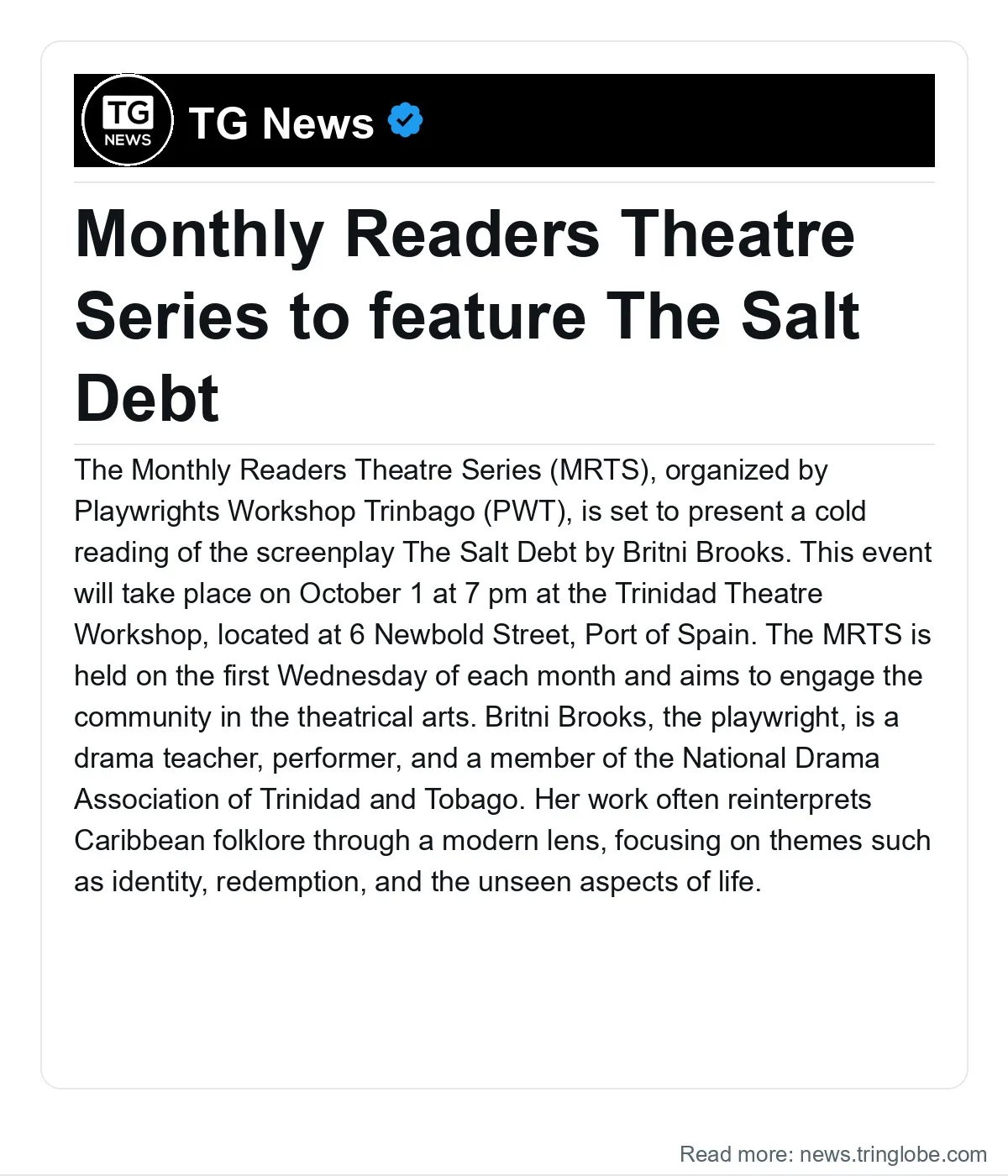 The Monthly Readers Theatre Series (MRTS), organized by Playwrights Workshop Trinbago (PWT), is set to present a cold reading of the screenplay The Salt Debt by Britni Brooks. This event will take place on October 1 at 7 pm at the Trinidad Theatre Workshop, located at 6 Newbold Street, Port of Spain. The MRTS is held on the first Wednesday of each month and aims to engage the community in the theatrical arts.