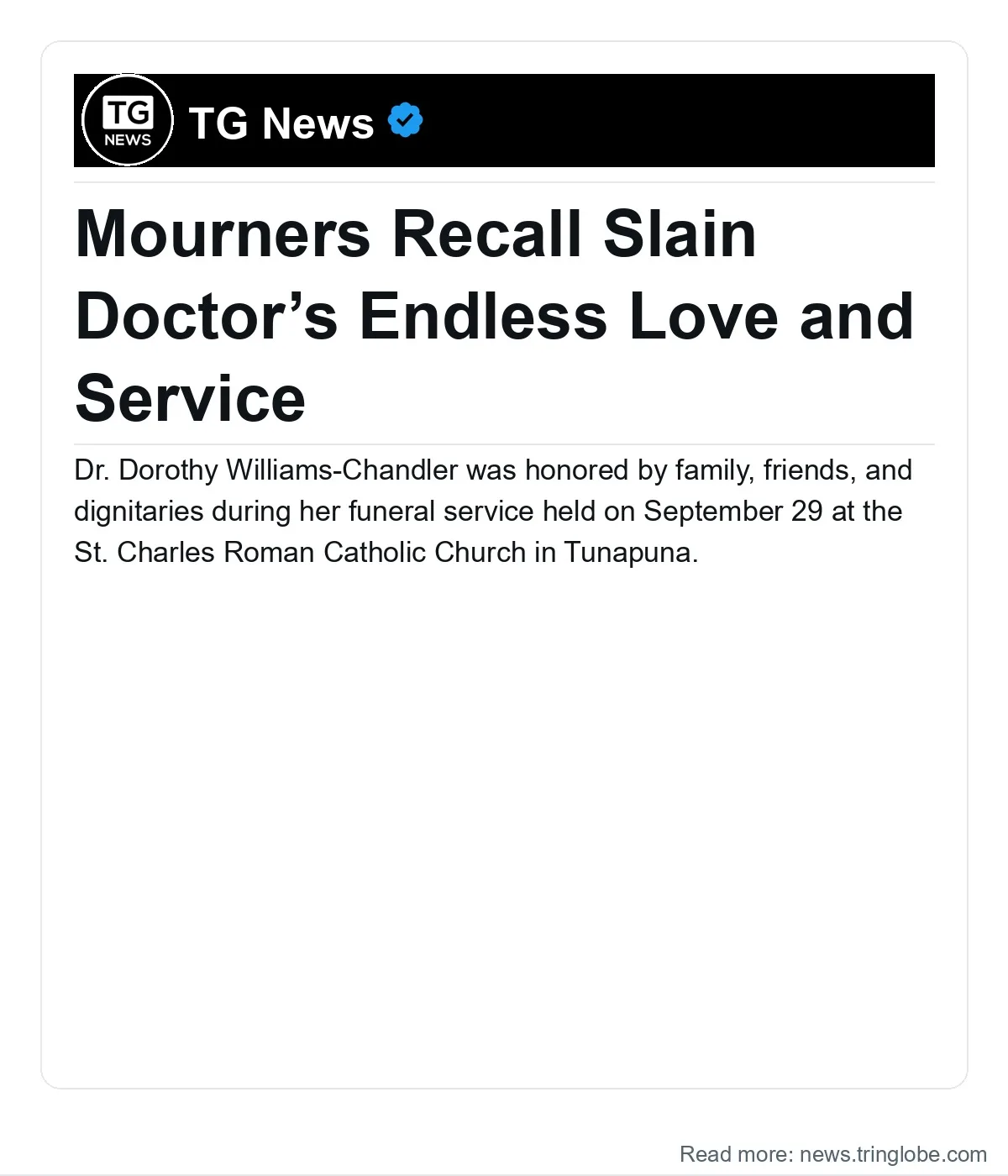 Dr. Dorothy Williams-Chandler was honored by family, friends, and dignitaries during her funeral service held on September 29 at the St. Charles Roman Catholic Church in Tunapuna. The service focused on her life as a compassionate healer and pioneering surgeon, rather than the tragic circumstances surrounding her death. Williams-Chandler passed away on September 18 after a 19-day battle in intensive care following a gunshot wound sustained on August 30, which is currently under police investigation.