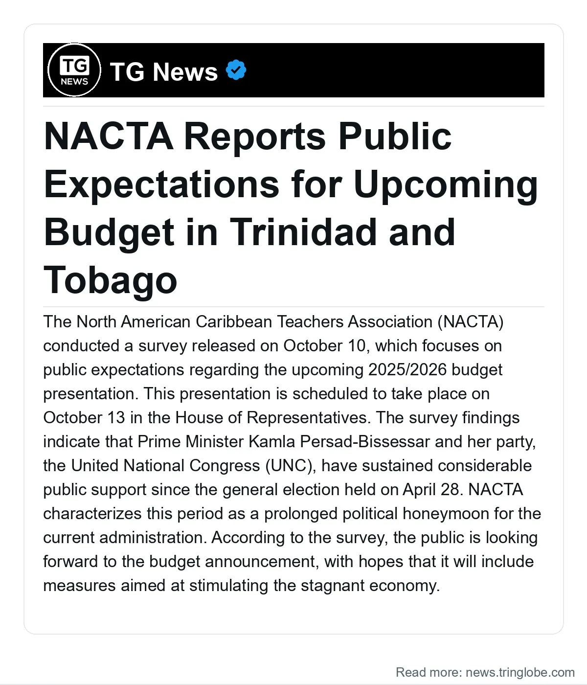 The North American Caribbean Teachers Association (NACTA) conducted a survey released on October 10, which focuses on public expectations regarding the upcoming 2025/2026 budget presentation. This presentation is scheduled to take place on October 13 in the House of Representatives.