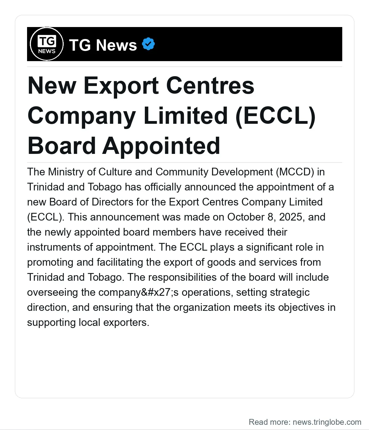 The Ministry of Culture and Community Development (MCCD) in Trinidad and Tobago has officially announced the appointment of a new Board of Directors for the Export Centres Company Limited (ECCL). This announcement was made on October 8, 2025, and the newly appointed board members have received their instruments of appointment.