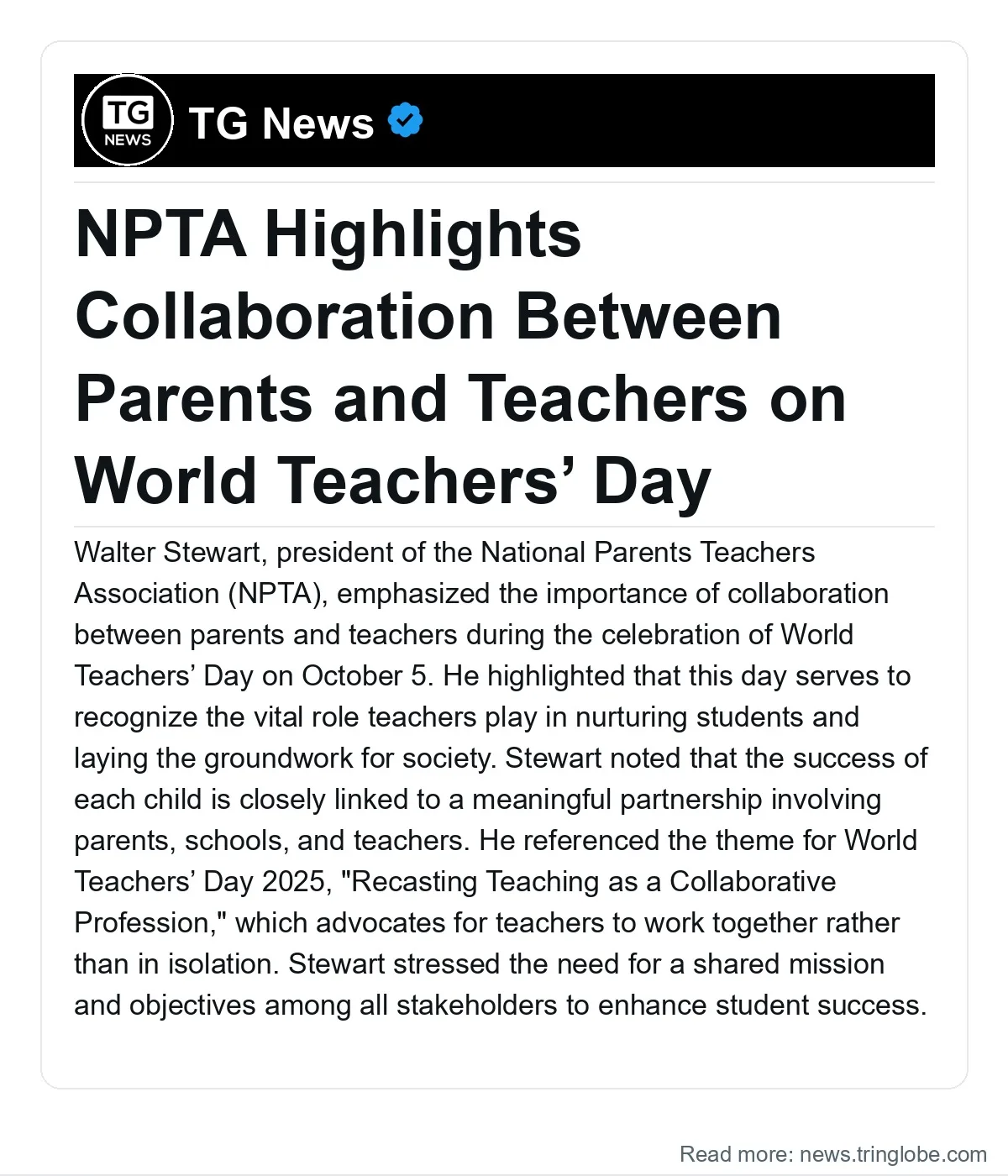 Walter Stewart, president of the National Parents Teachers Association (NPTA), emphasized the importance of collaboration between parents and teachers during the celebration of World Teachers’ Day on October 5. He highlighted that this day serves to recognize the vital role teachers play in nurturing students and laying the groundwork for society.