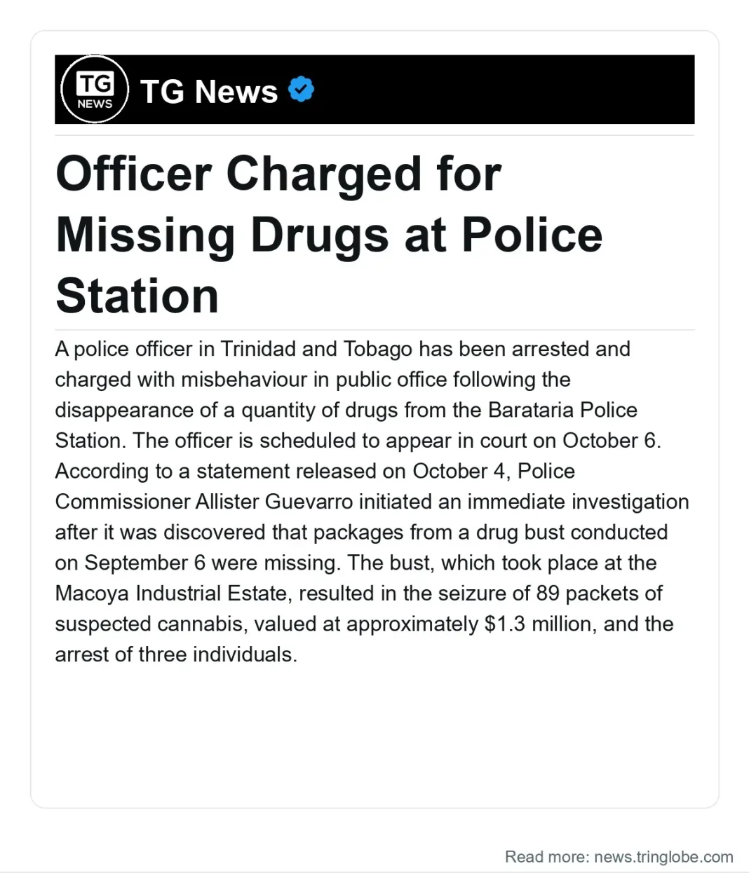 According to a statement released on October 4, Police Commissioner Allister Guevarro initiated an immediate investigation after it was discovered that packages from a drug bust conducted on September 6 were missing. The bust, which took place at the Macoya Industrial Estate, resulted in the seizure of 89 packets of suspected cannabis, valued at approximately $1.3 million, and the arrest of three individuals.