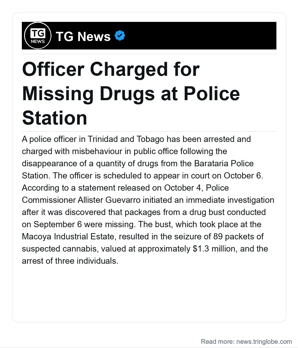 According to a statement released on October 4, Police Commissioner Allister Guevarro initiated an immediate investigation after it was discovered that packages from a drug bust conducted on September 6 were missing. The bust, which took place at the Macoya Industrial Estate, resulted in the seizure of 89 packets of suspected cannabis, valued at approximately $1.3 million, and the arrest of three individuals.