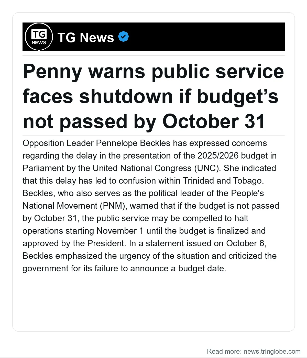 Beckles, who also serves as the political leader of the People’s National Movement (PNM), warned that if the budget is not passed by October 31, the public service may be compelled to halt operations starting November 1 until the budget is finalized and approved by the President.
