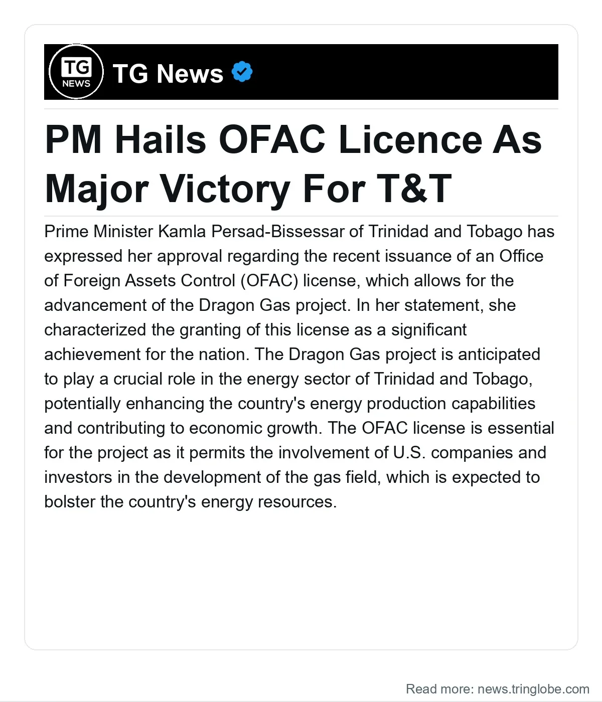 Prime Minister Kamla Persad-Bissessar of Trinidad and Tobago has expressed her approval regarding the recent issuance of an Office of Foreign Assets Control (OFAC) license, which allows for the advancement of the Dragon Gas project. In her statement, she characterized the granting of this license as a significant achievement for the nation.