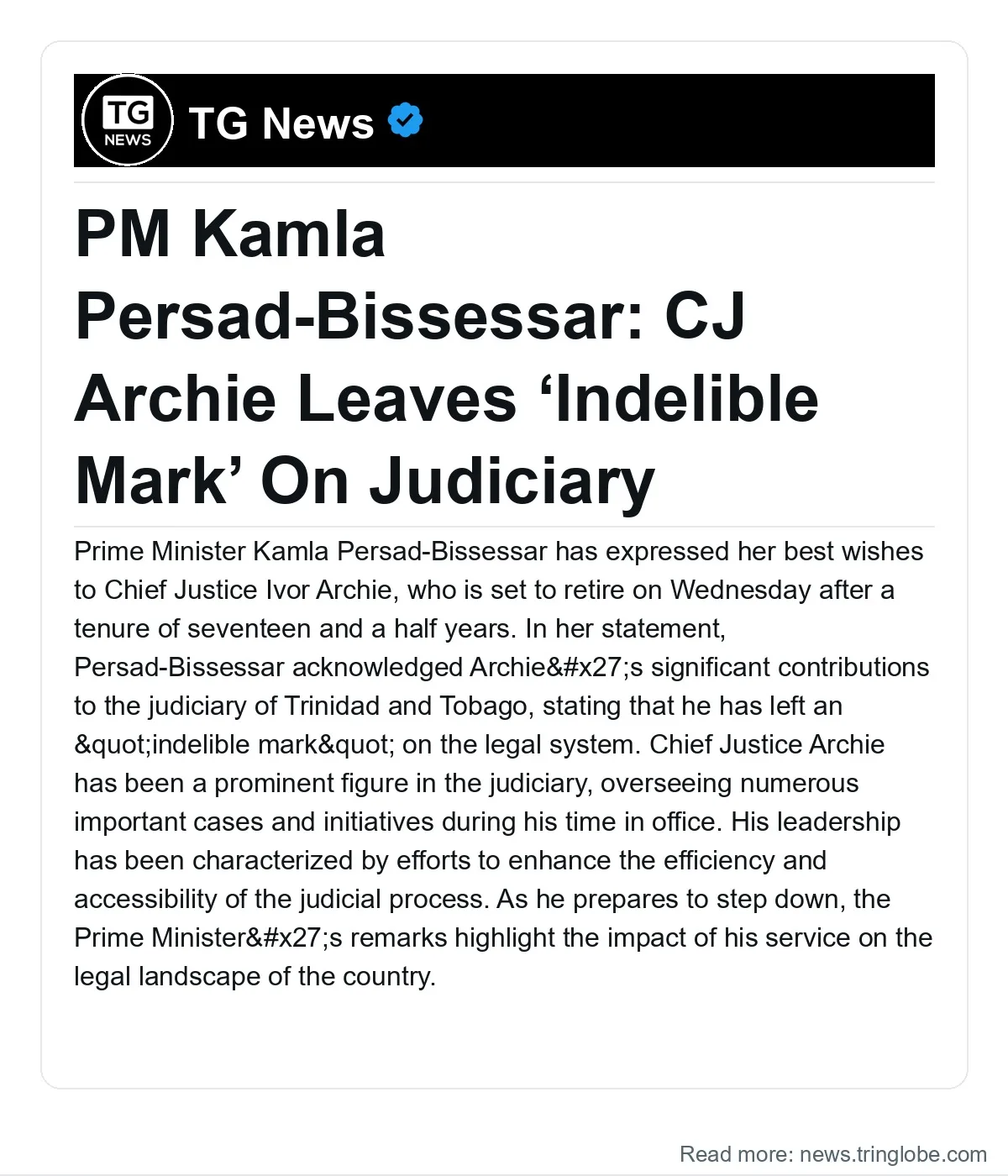 Prime Minister Kamla Persad-Bissessar has expressed her best wishes to Chief Justice Ivor Archie, who is set to retire on Wednesday after a tenure of seventeen and a half years. In her statement, Persad-Bissessar acknowledged Archie's significant contributions to the judiciary of Trinidad and Tobago, stating that he has left an "indelible mark" on the legal system.