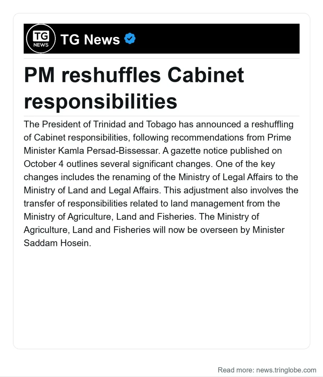 The President of Trinidad and Tobago has announced a reshuffling of Cabinet responsibilities, following recommendations from Prime Minister Kamla Persad-Bissessar. A gazette notice published on October 4 outlines several significant changes.