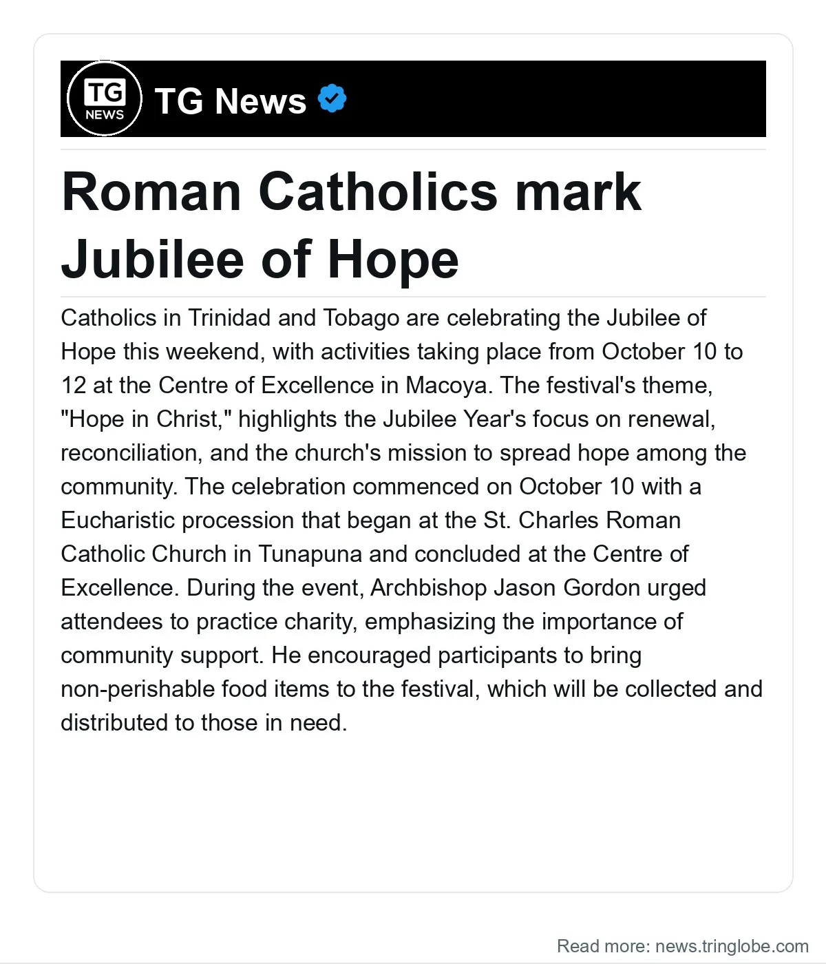 Catholics in Trinidad and Tobago are celebrating the Jubilee of Hope this weekend, with activities taking place from October 10 to 12 at the Centre of Excellence in Macoya. The festival’s theme, “Hope in Christ,” highlights the Jubilee Year’s focus on renewal, reconciliation, and the church’s mission to spread hope among the community.