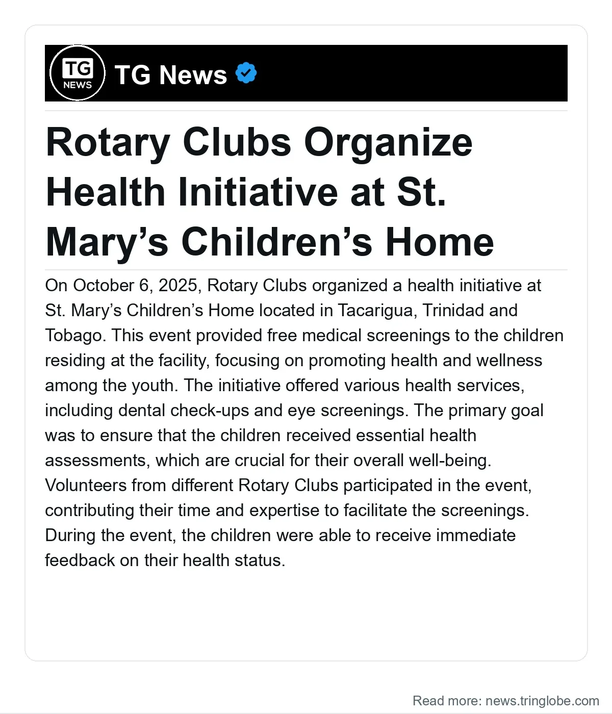On October 6, 2025, Rotary Clubs organized a health initiative at St. Mary’s Children’s Home located in Tacarigua, Trinidad and Tobago. This event provided free medical screenings to the children residing at the facility, focusing on promoting health and wellness among the youth.