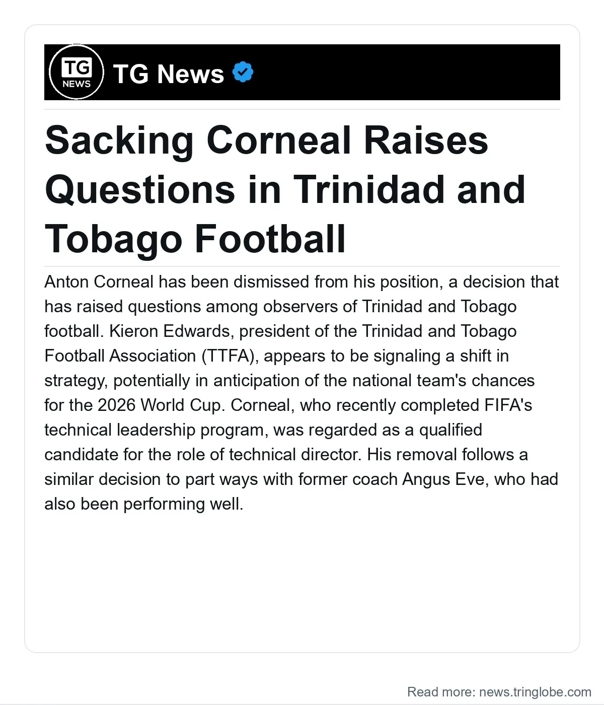 Anton Corneal has been dismissed from his position, a decision that has raised questions among observers of Trinidad and Tobago football. Kieron Edwards, president of the Trinidad and Tobago Football Association (TTFA), appears to be signaling a shift in strategy, potentially in anticipation of the national team’s chances for the 2026 World Cup.
