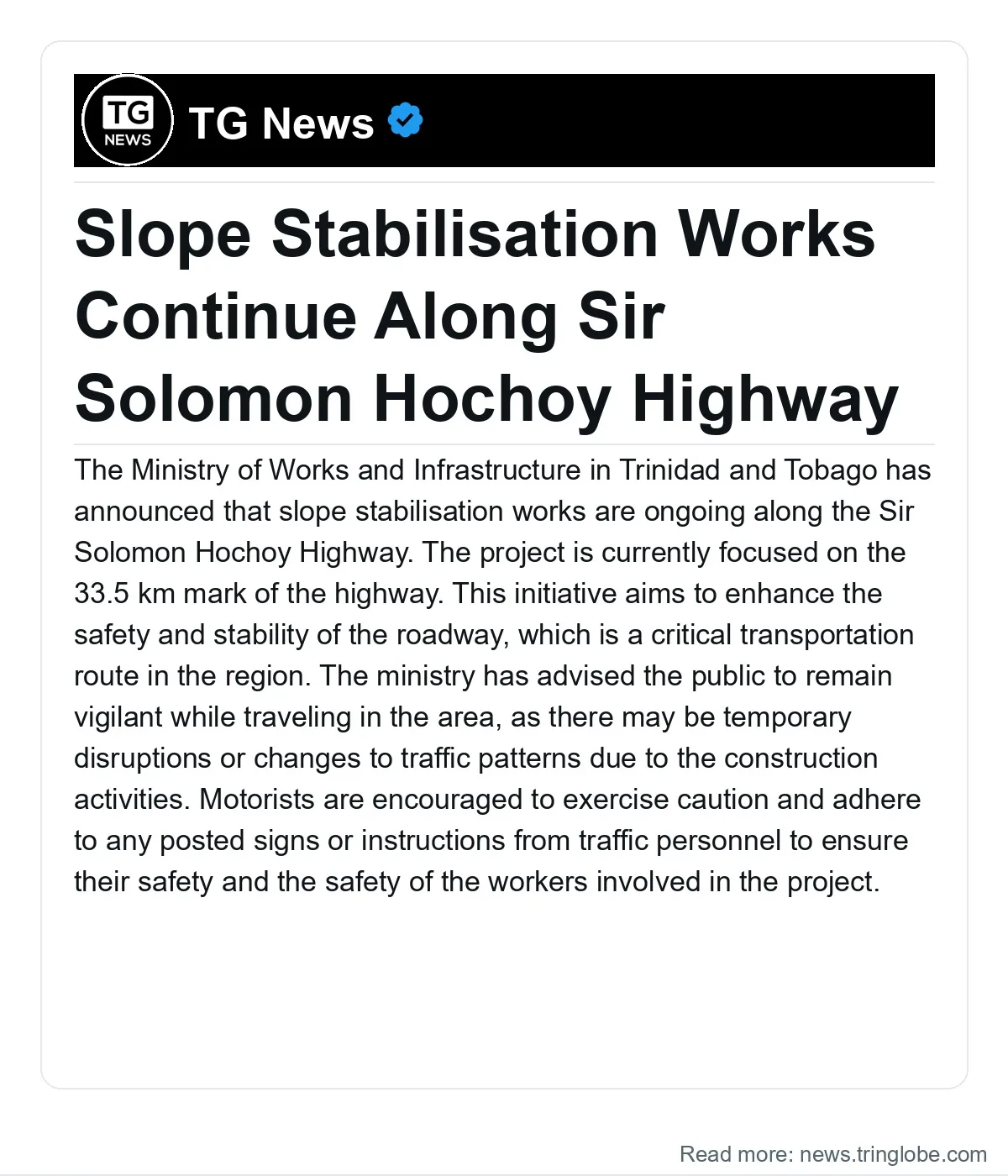 The Ministry of Works and Infrastructure in Trinidad and Tobago has announced that slope stabilisation works are ongoing along the Sir Solomon Hochoy Highway. The project is currently focused on the 33.5 km mark of the highway. This initiative aims to enhance the safety and stability of the roadway, which is a critical transportation route in the region.