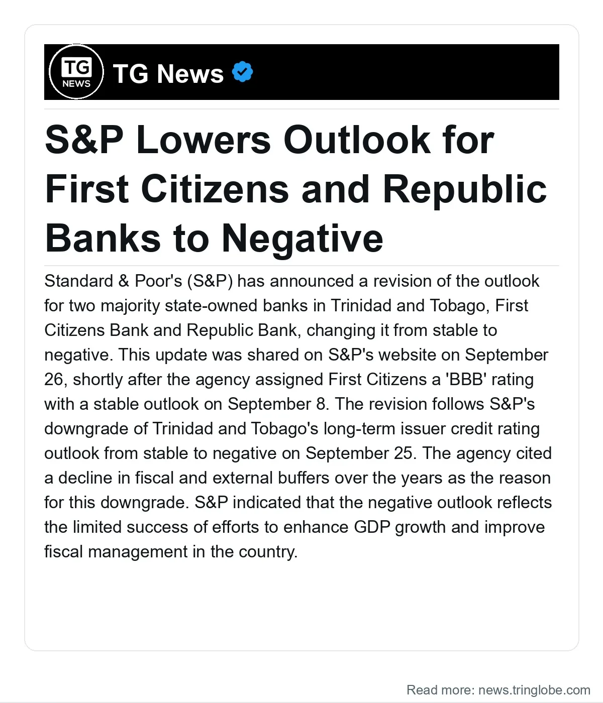Despite the outlook downgrade, S&P maintains that both banks have a stable credit profile, supported by strong capitalization, good business diversification, and solid market positions. However, the agency acknowledged that Trinidad and Tobago’s reliance on the energy sector poses risks to the banks’ stability.