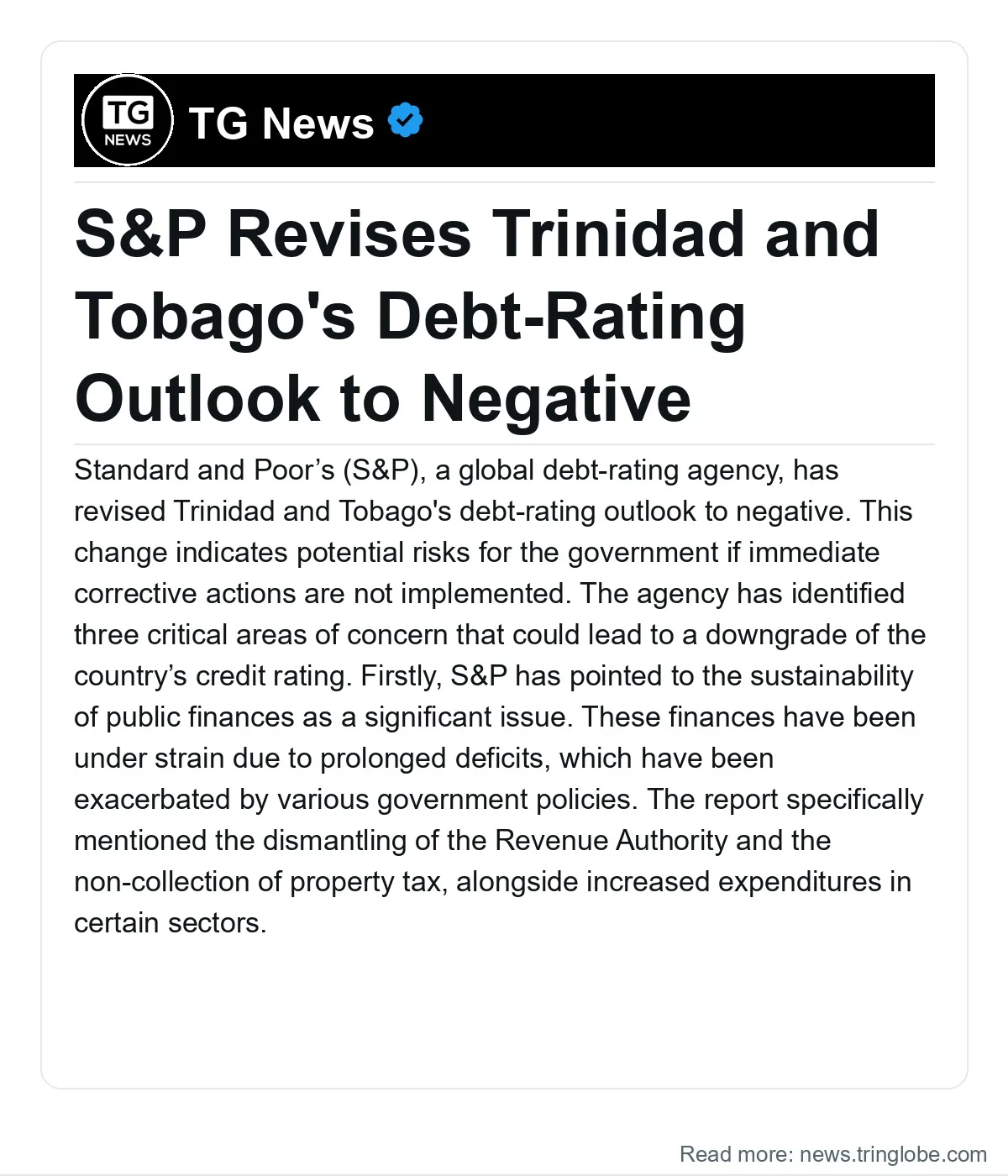 In summary, S&P’s negative outlook serves as a warning for Trinidad and Tobago, emphasizing the need for immediate action to address public finance sustainability, economic growth, and external sector vulnerabilities. The coming months will be crucial for the government as it seeks to implement strategies that can stabilize the economy and restore investor confidence.