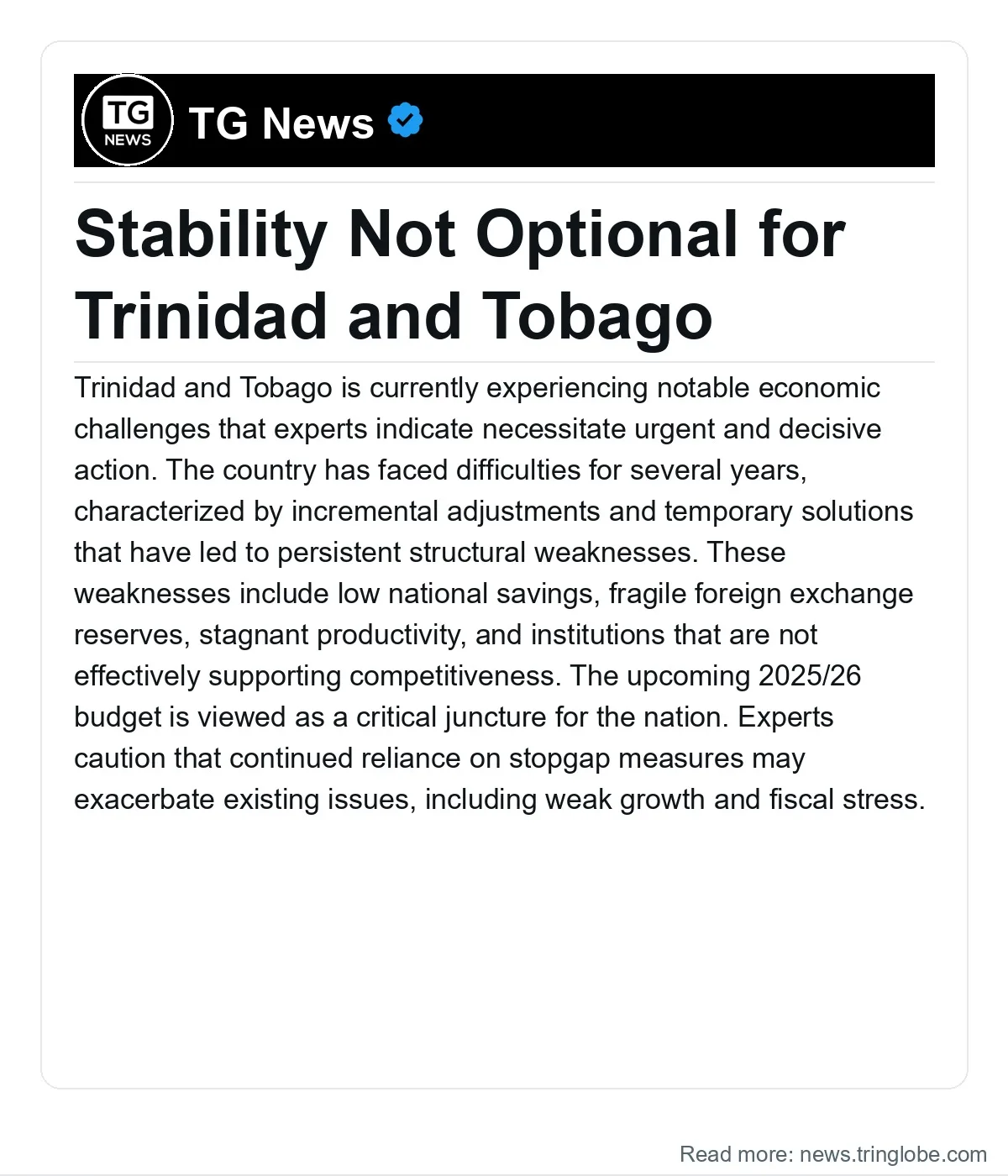 Trinidad and Tobago is currently experiencing notable economic challenges that experts indicate necessitate urgent and decisive action. The country has faced difficulties for several years, characterized by incremental adjustments and temporary solutions that have led to persistent structural weaknesses. These weaknesses include low national savings, fragile foreign exchange reserves, stagnant productivity, and institutions that are not effectively supporting competitiveness.