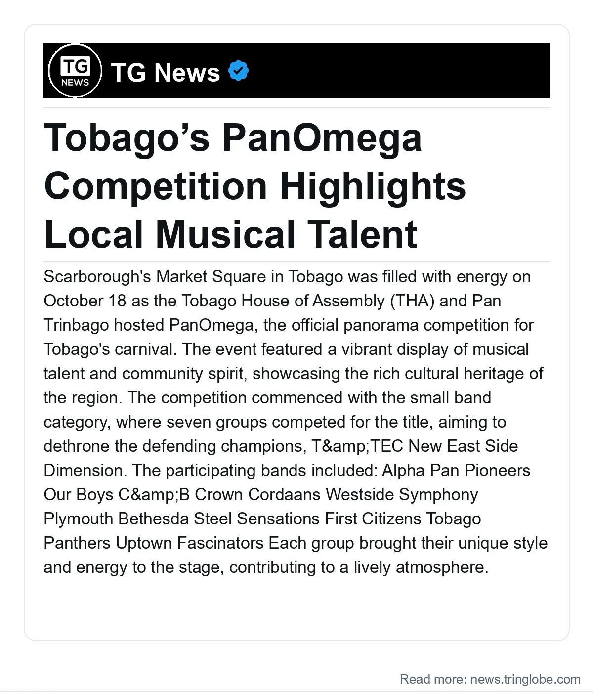 Scarborough’s Market Square in Tobago was filled with energy on October 18 as the Tobago House of Assembly (THA) and Pan Trinbago hosted PanOmega, the official panorama competition for Tobago’s carnival. The event featured a vibrant display of musical talent and community spirit, showcasing the rich cultural heritage of the region.
