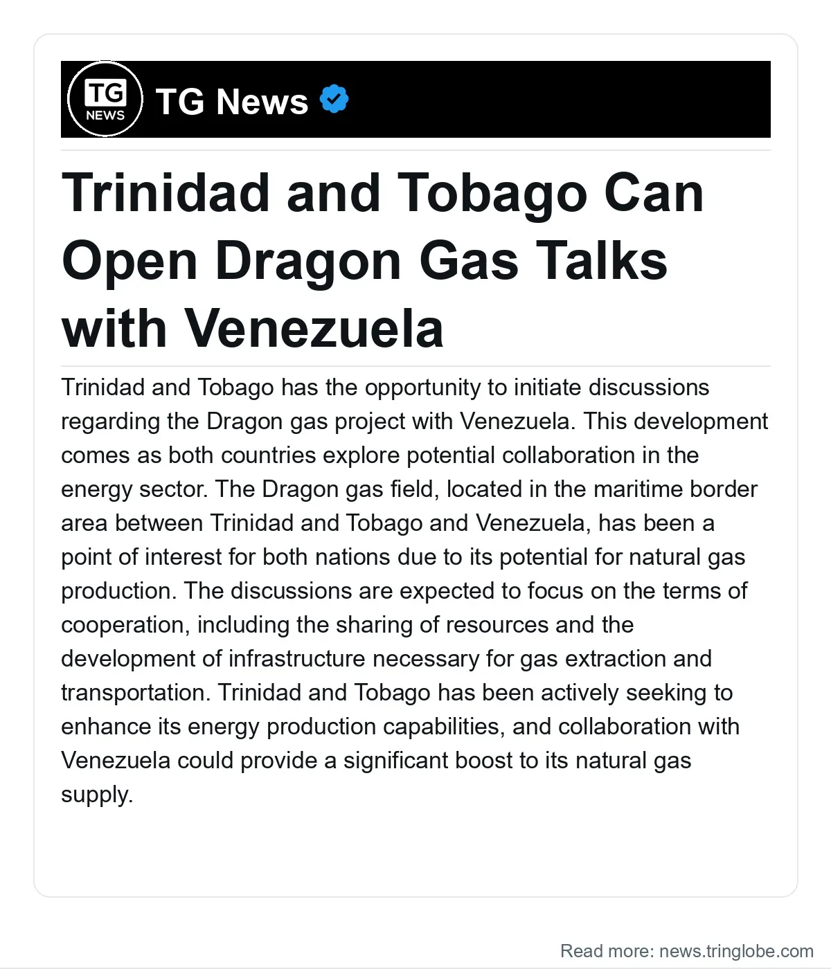 Trinidad and Tobago has the opportunity to initiate discussions regarding the Dragon gas project with Venezuela. This development comes as both countries explore potential collaboration in the energy sector. The Dragon gas field, located in the maritime border area between Trinidad and Tobago and Venezuela, has been a point of interest for both nations due to its potential for natural gas production.