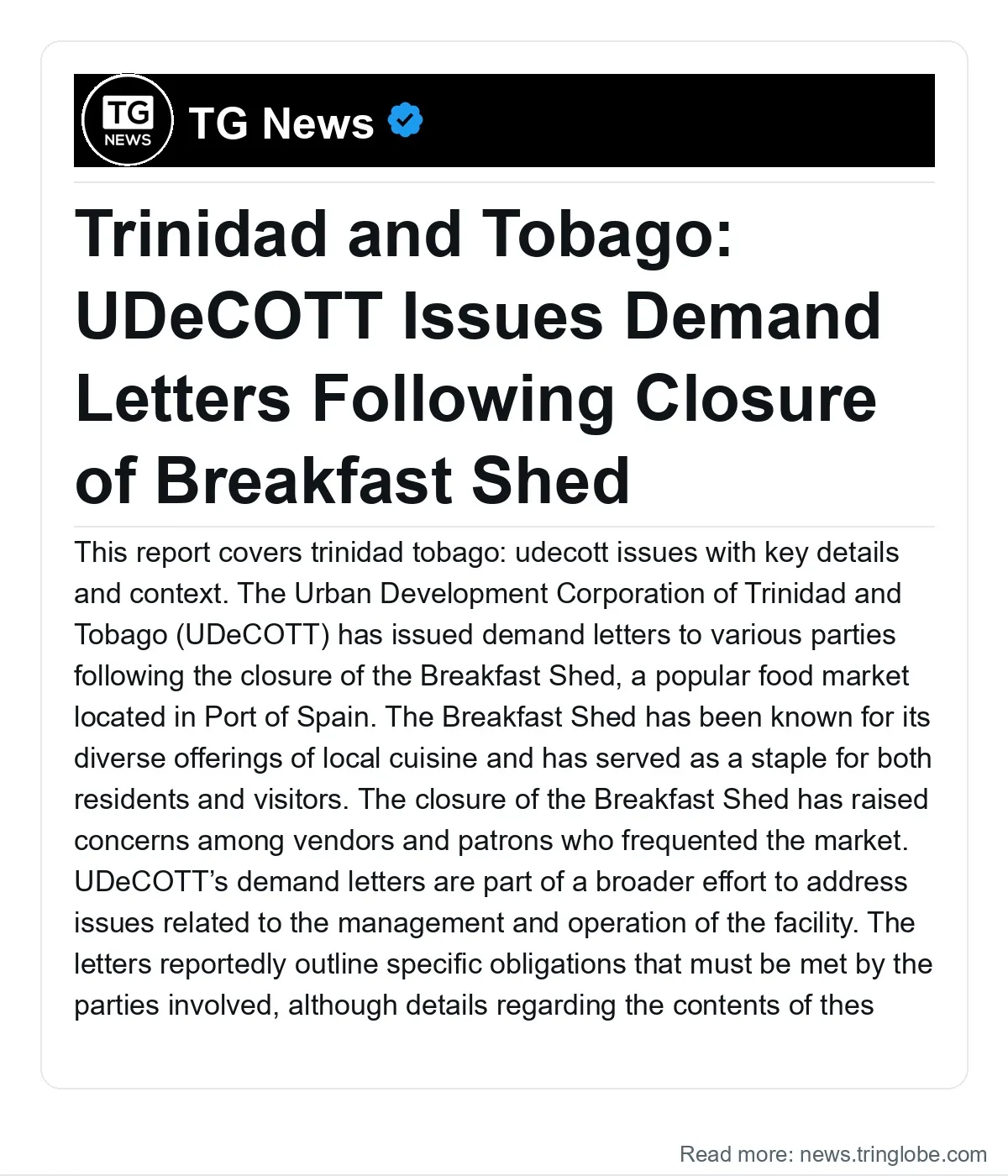 The Urban Development Corporation of Trinidad and Tobago (UDeCOTT) has issued demand letters to various parties following the closure of the Breakfast Shed, a popular food market located in Port of Spain. The Breakfast Shed has been known for its diverse offerings of local cuisine and has served as a staple for both residents and visitors.