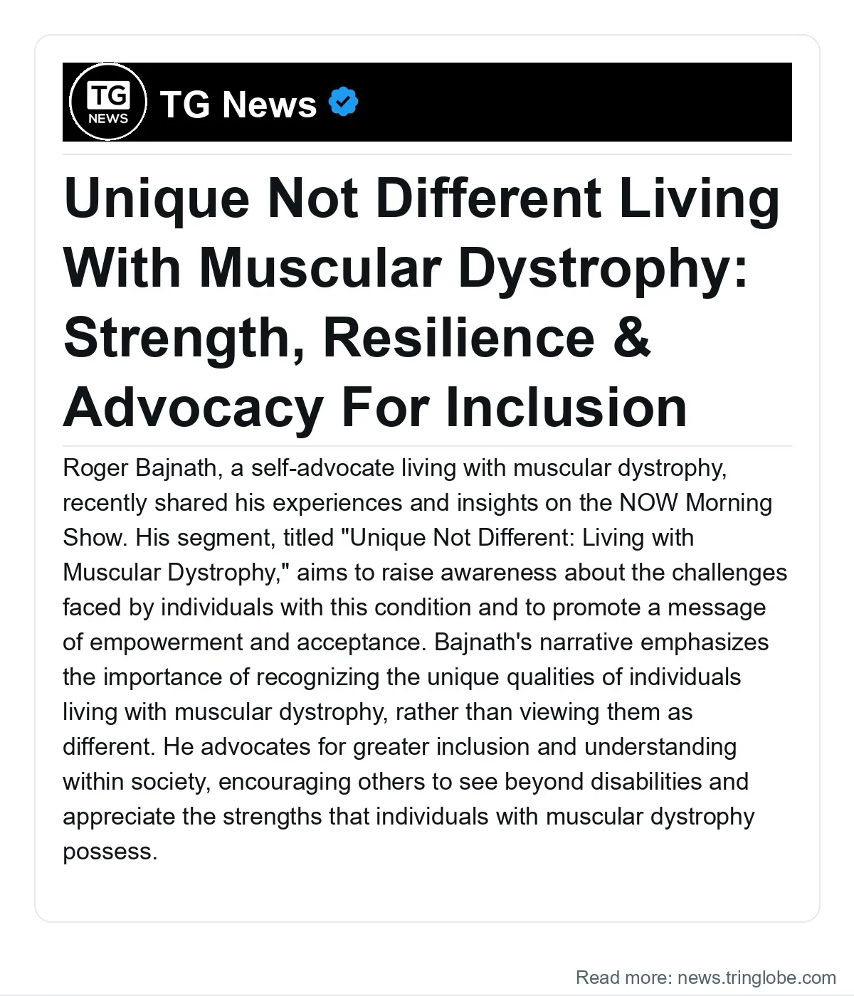 Roger Bajnath, a self-advocate living with muscular dystrophy, recently shared his experiences and insights on the NOW Morning Show. His segment, titled “Unique Not Different: Living with Muscular Dystrophy,” aims to raise awareness about the challenges faced by individuals with this condition and to promote a message of empowerment and acceptance.