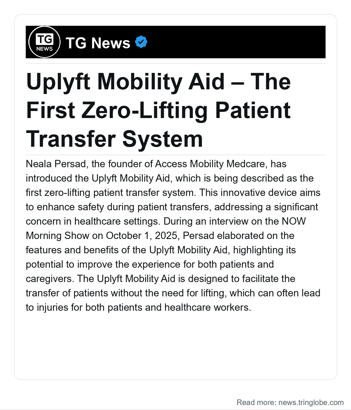 Neala Persad, the founder of Access Mobility Medcare, has introduced the Uplyft Mobility Aid, which is being described as the first zero-lifting patient transfer system. This innovative device aims to enhance safety during patient transfers, addressing a significant concern in healthcare settings. During an interview on the NOW Morning Show on October 1, 2025, Persad elaborated on the features and benefits of the Uplyft Mobility Aid, highlighting its potential to improve the experience for both patients and caregivers.