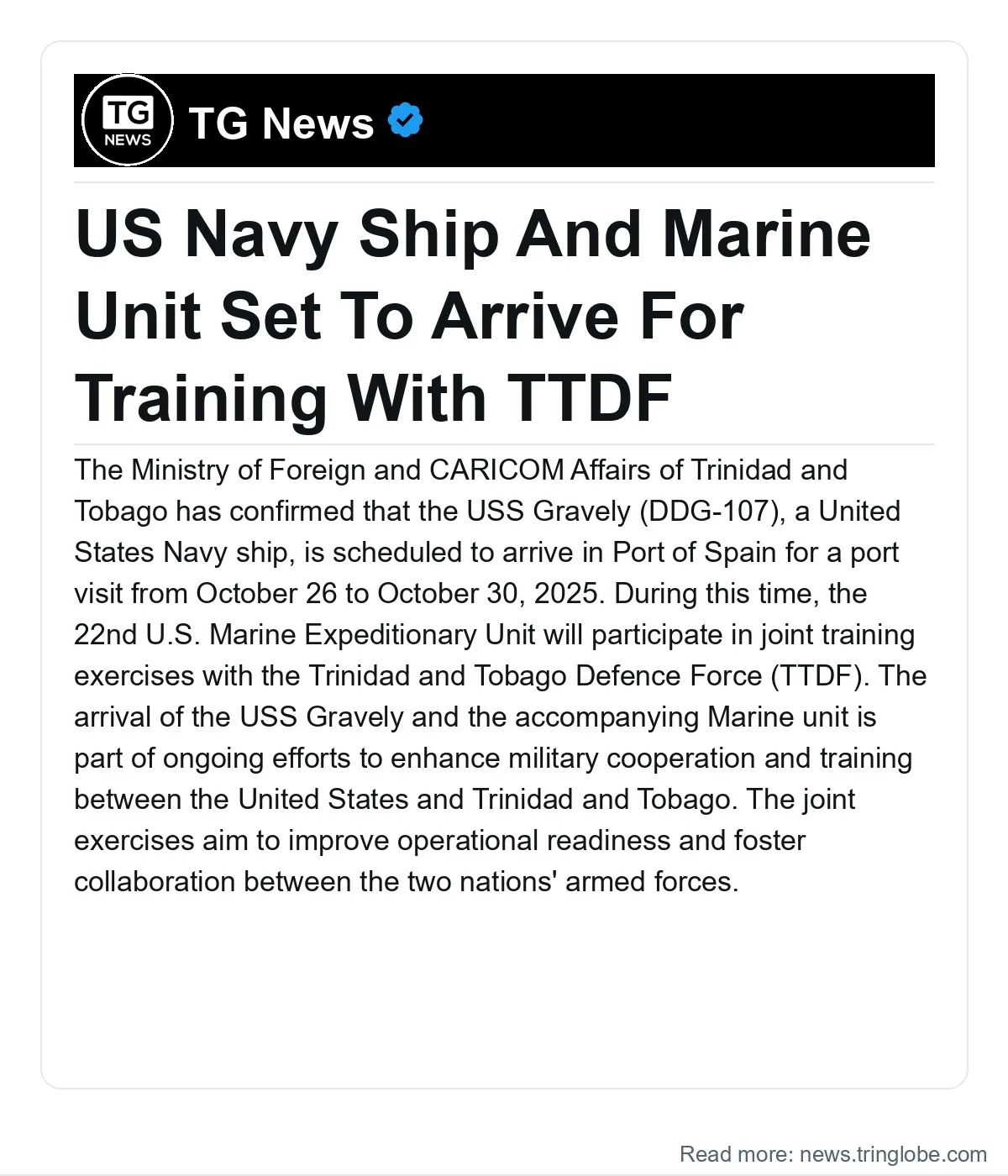 The Ministry of Foreign and CARICOM Affairs of Trinidad and Tobago has confirmed that the USS Gravely (DDG-107), a United States Navy ship, is scheduled to arrive in Port of Spain for a port visit from October 26 to October 30, 2025. During this time, the 22nd U.S. Marine Expeditionary Unit will participate in joint training exercises with the Trinidad and Tobago Defence Force (TTDF).