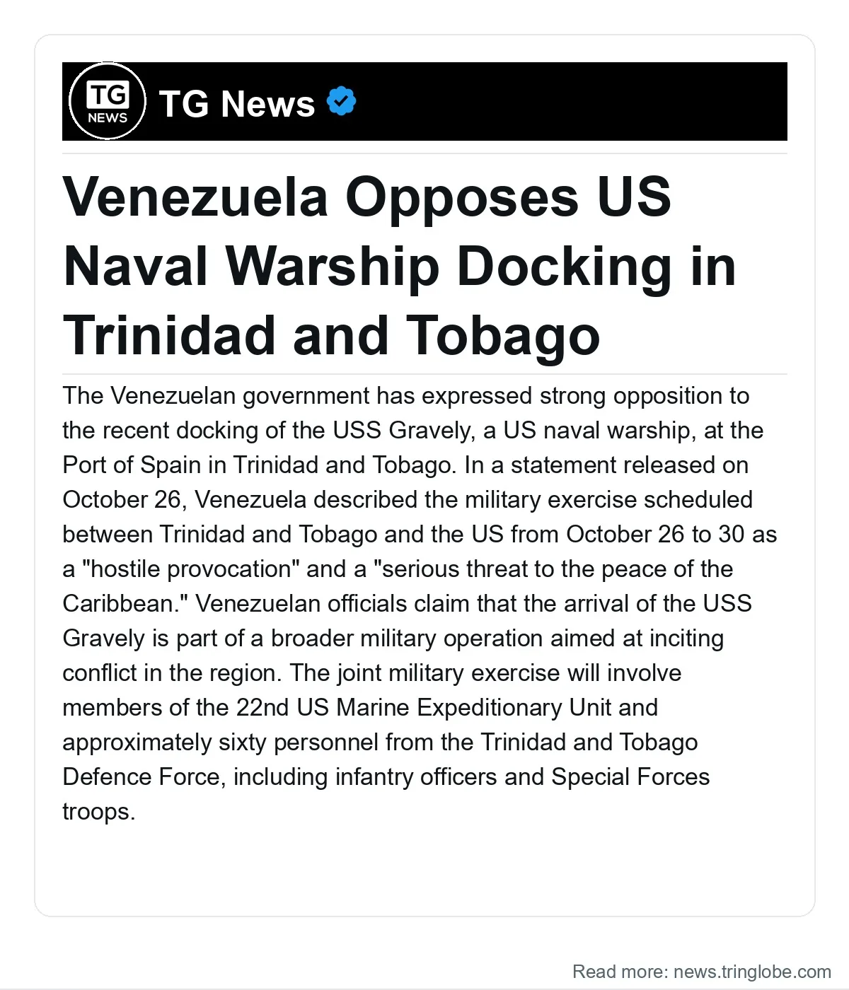 The Venezuelan government has expressed strong opposition to the recent docking of the USS Gravely, a US naval warship, at the Port of Spain in Trinidad and Tobago. In a statement released on October 26, Venezuela described the military exercise scheduled between Trinidad and Tobago and the US from October 26 to 30 as a “hostile provocation” and a “serious threat to the peace of the Caribbean.” Venezuelan officials claim that the arrival of the USS Gravely is part of a broader military operation aimed at inciting conflict in the region.