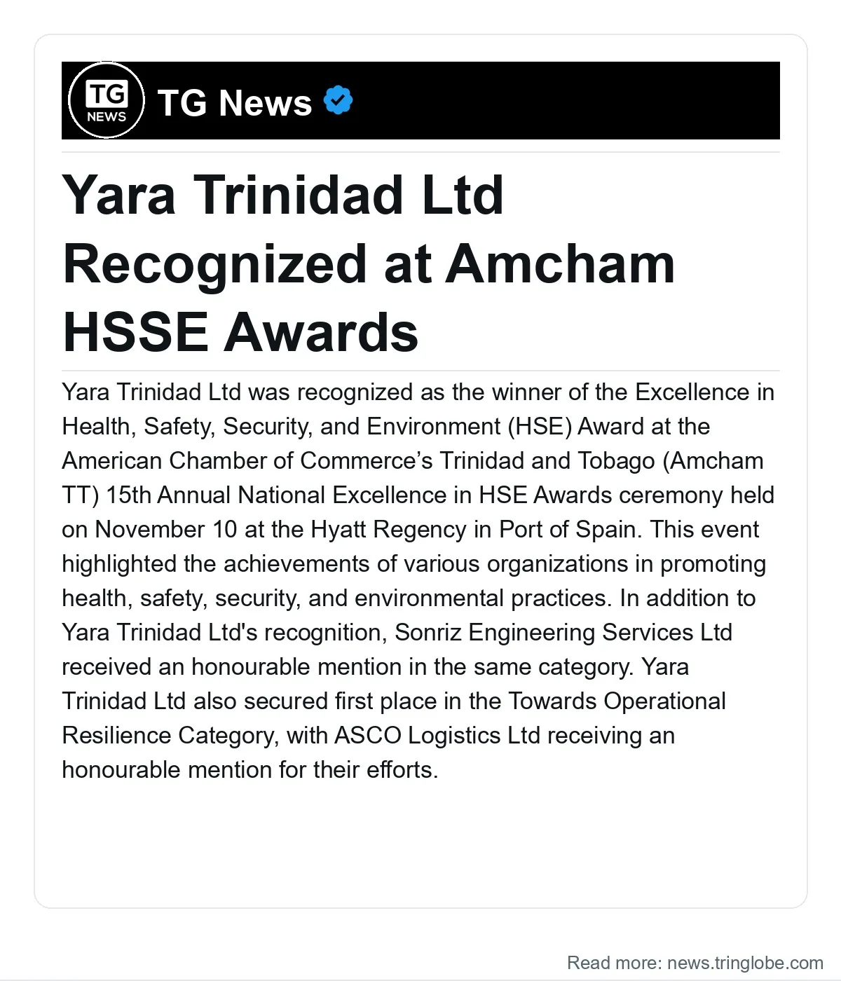 Yara Trinidad Ltd was recognized as the winner of the Excellence in Health, Safety, Security, and Environment (HSE) Award at the American Chamber of Commerce’s Trinidad and Tobago (Amcham TT) 15th Annual National Excellence in HSE Awards ceremony held on November 10 at the Hyatt Regency in Port of Spain. This event highlighted the achievements of various organizations in promoting health, safety, security, and environmental practices.